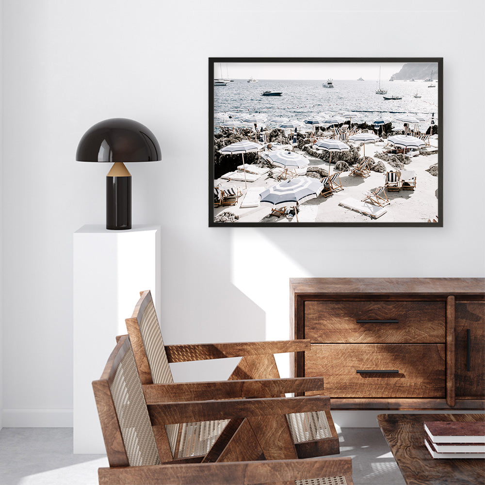 This calming coastal themed artwork, featuring blue and white striped umbrellas by the sparkling ocean water, captures the laid-back beauty of the Amalfi Coast in Capri, Italy and was photographed by The Print Emporium design team in Europe