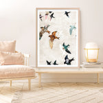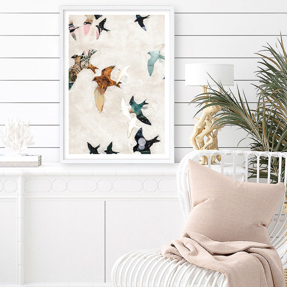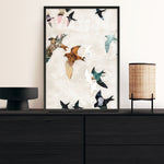 Shop Abstract Birds 1 Art Print by Design Fabrikken and update your wall decor at home easily with this colourful flock of birds artwork print from our hand painted print collection.