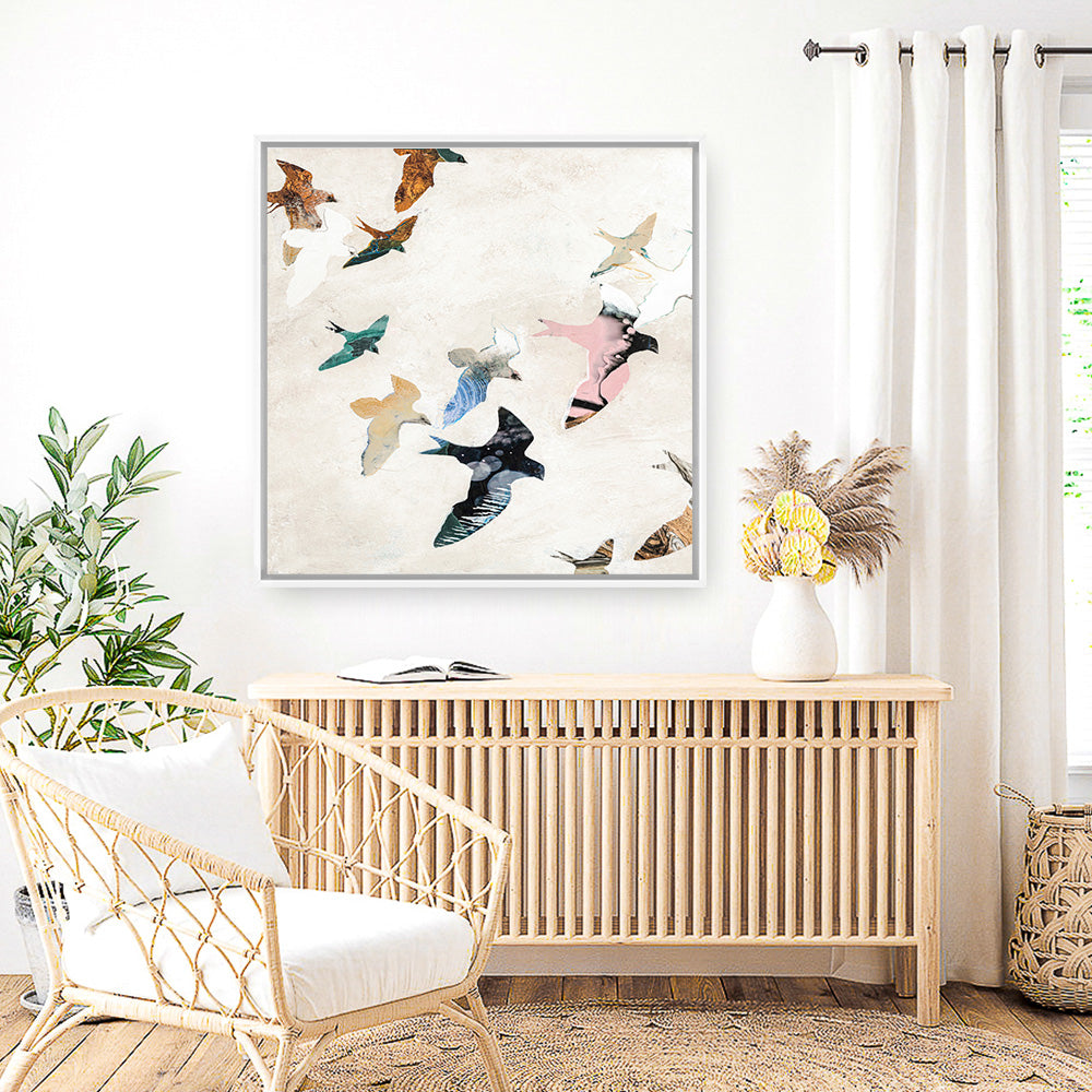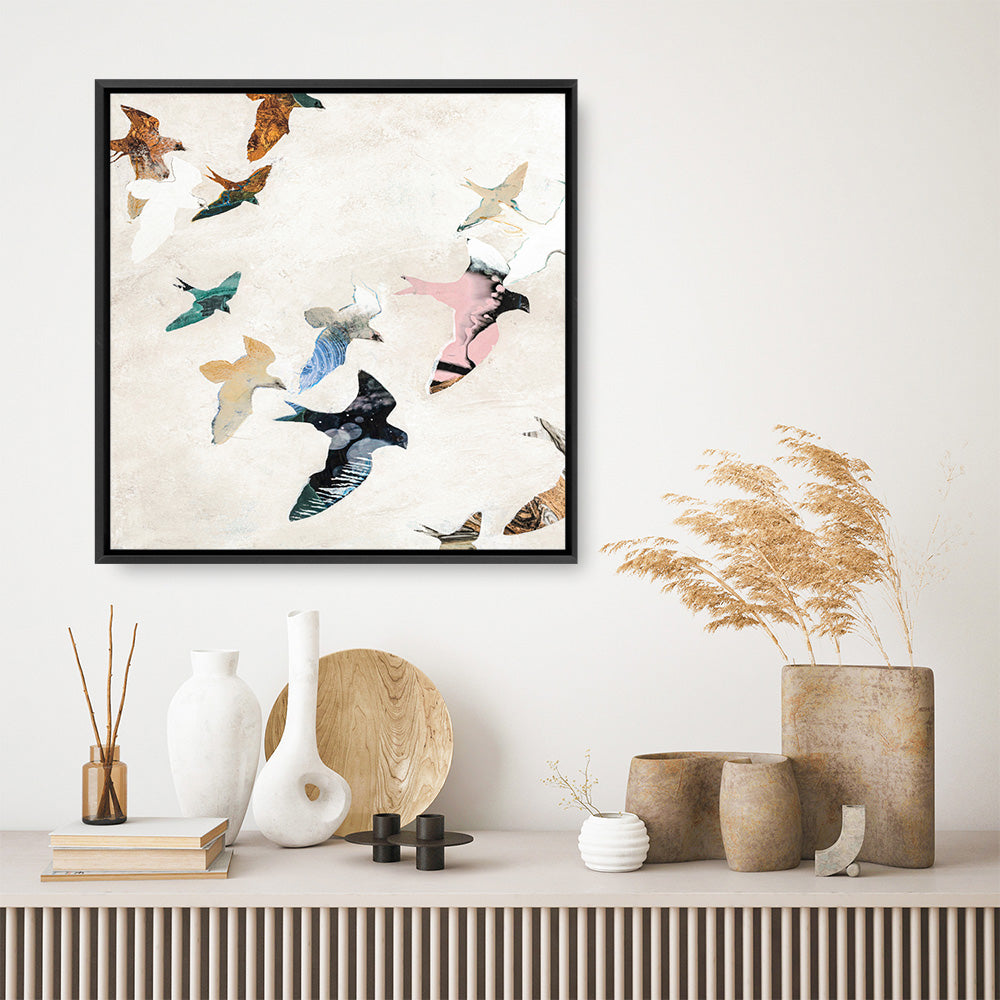 Shop Abstract Birds 2 (Square) Canvas Print by Design Fabrikken and update your wall decor at home easily with this colourful flock of birds square artwork from our hand painted canvas print collection.