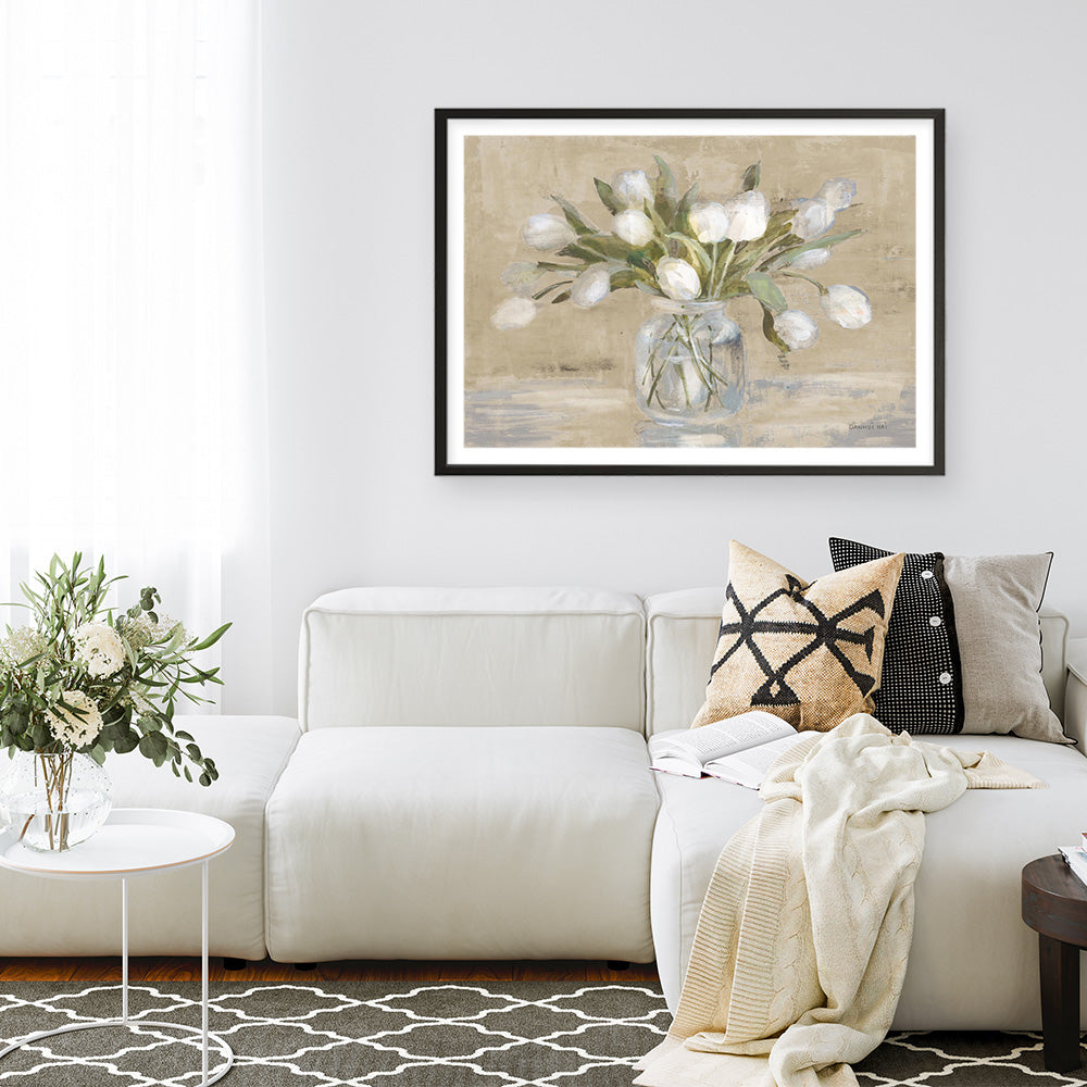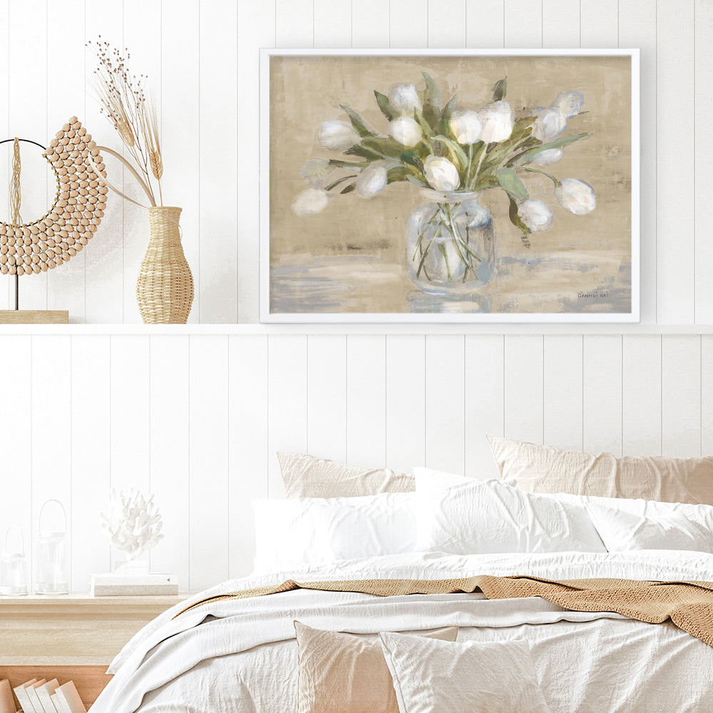 Shop April Tulips Neutral Art Print by Danhui Nai and update your wall decor at home easily with this vase of beautiful tulips from our abstract hand painted print collection.