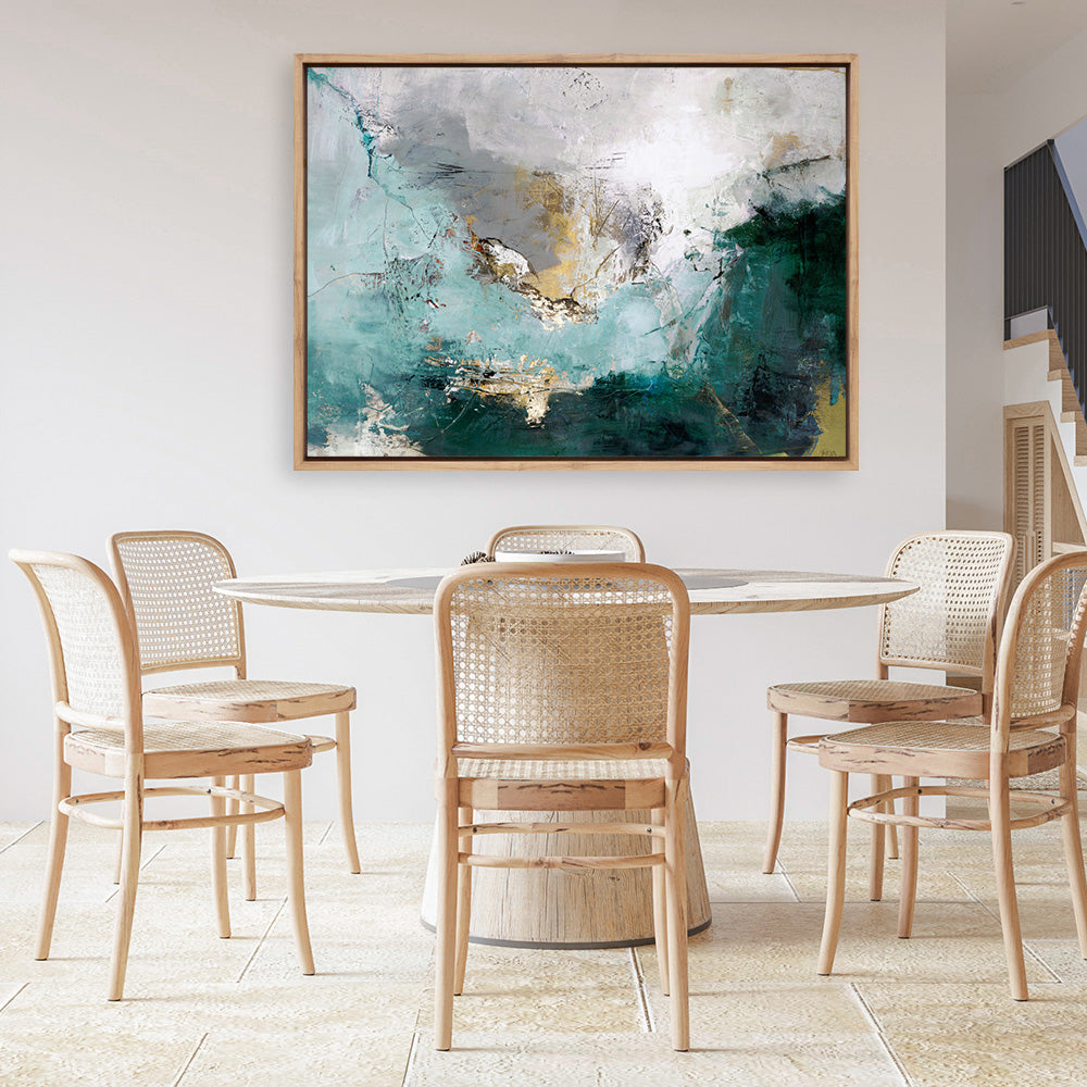 Shop Arctic Green Variation Canvas Print by Design Fabrikken and update your wall decor at home easily with this abstract splash of white and green artwork from our hand painted canvas print collection.