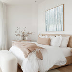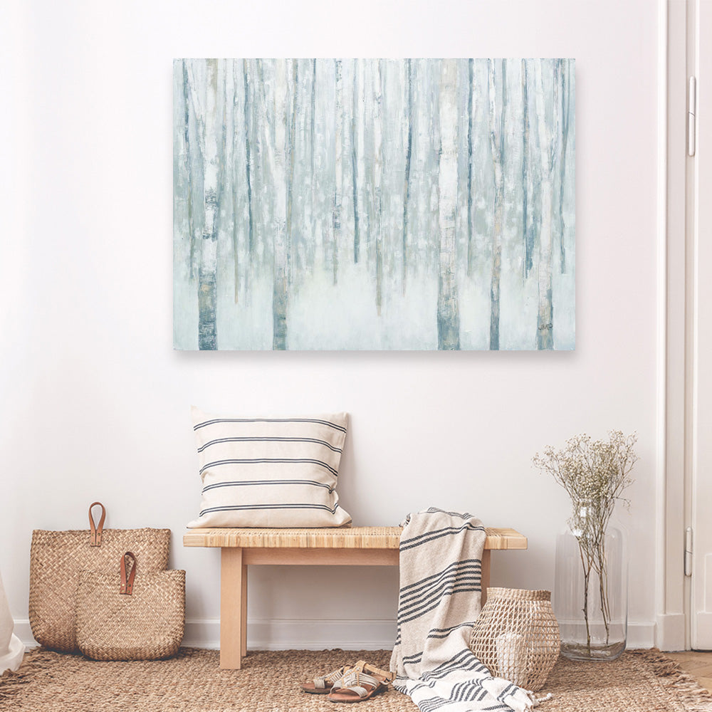 Shop Birches in Winter Blue Gray Canvas Print by Julia Purinton and update your wall decor at home easily with this snowy forest themed artwork from our abstract hand painted print collection .