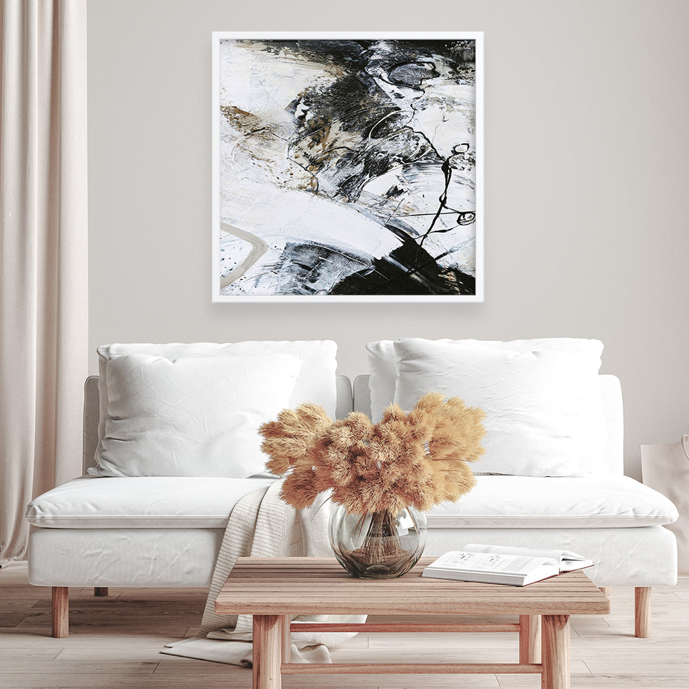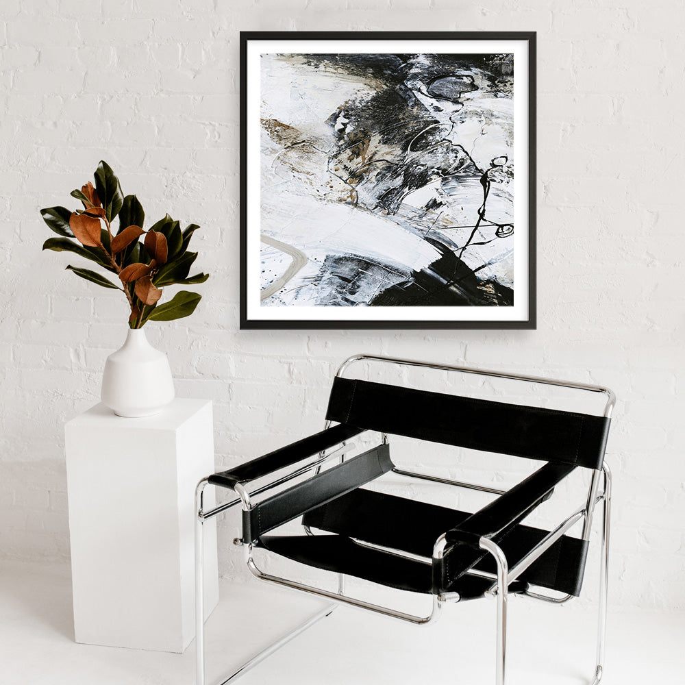 Shop Black and White 1 (Square) Art Print by Design Fabrikken and update your wall decor at home easily with this splash of black gold abstract square artwork from our hand painted print collection.