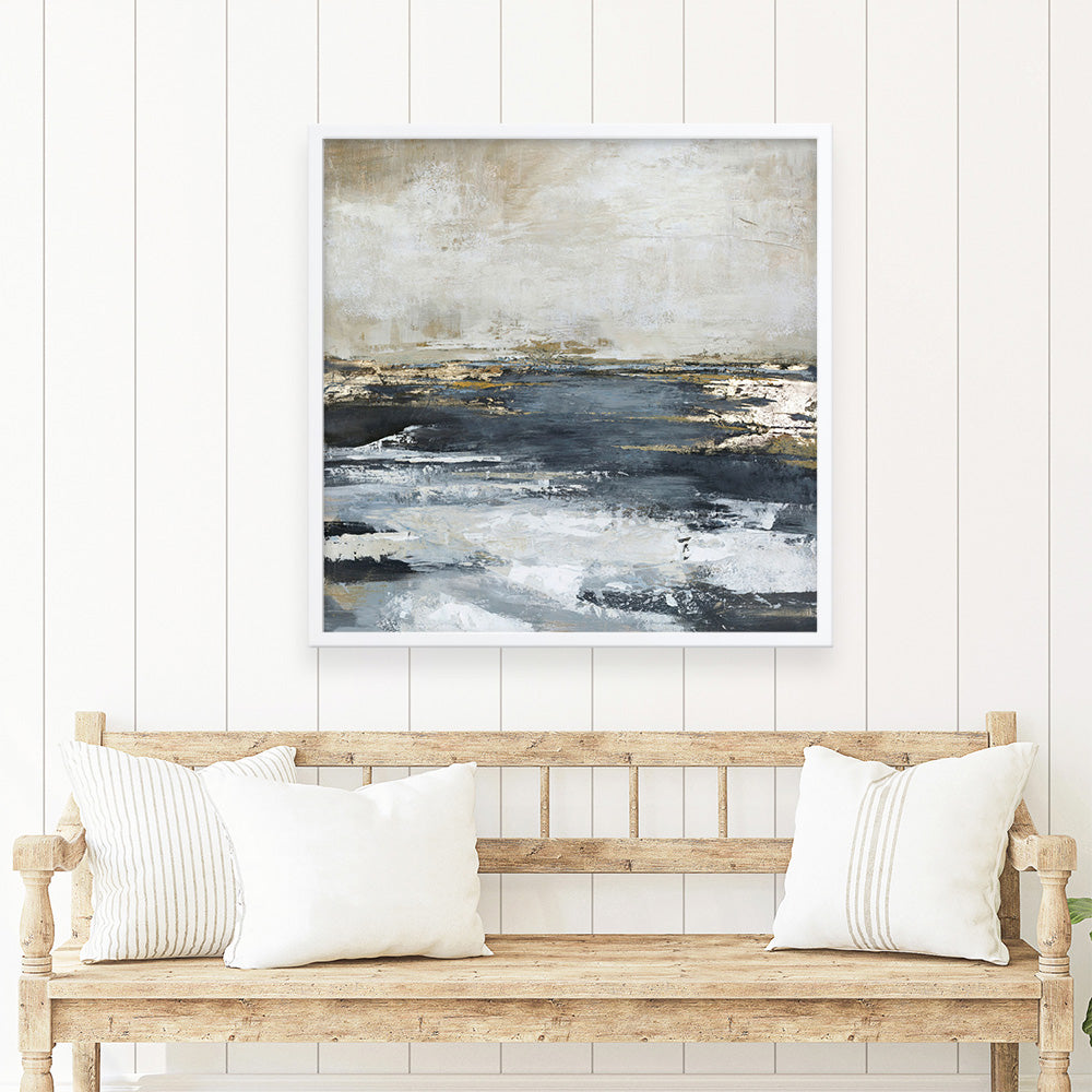 Shop Blue Bay (Square) Art Print by Design Fabrikken and update your wall decor at home easily with this calm coastal view square artwork from our hand painted print collection.