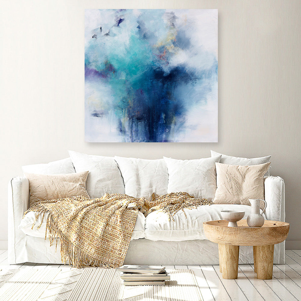 Shop Blue Fusion 2 (Square) Canvas Print by Karen Hale and update your wall decor at home easily with this splash of blue minimalist square artwork from our hand painted canvas print collection.