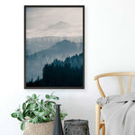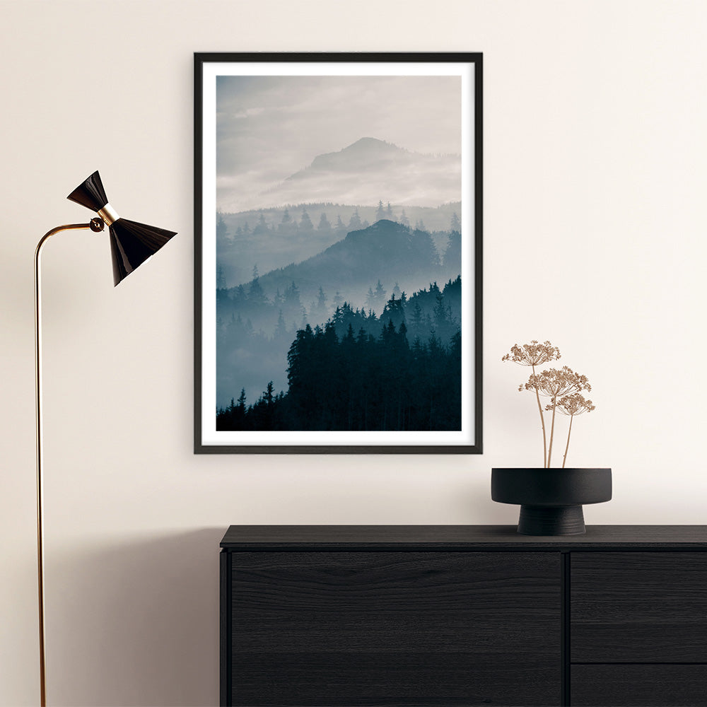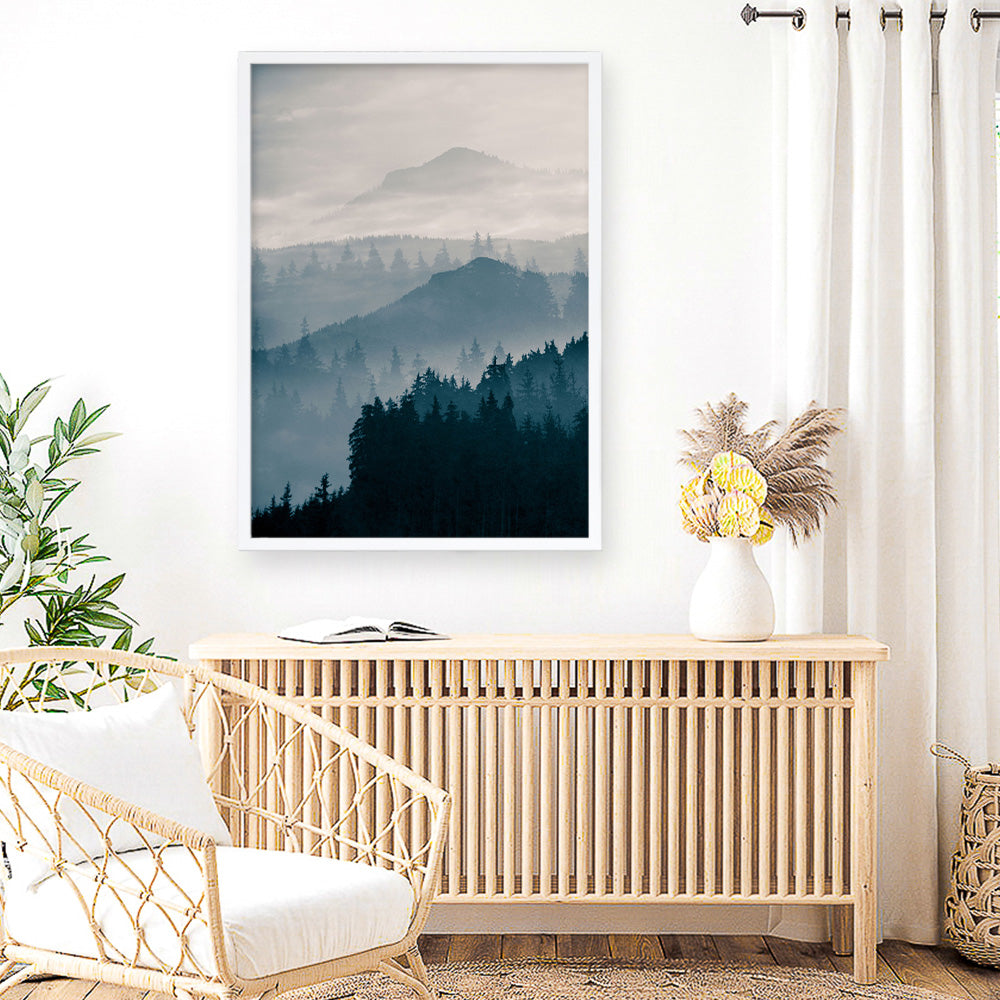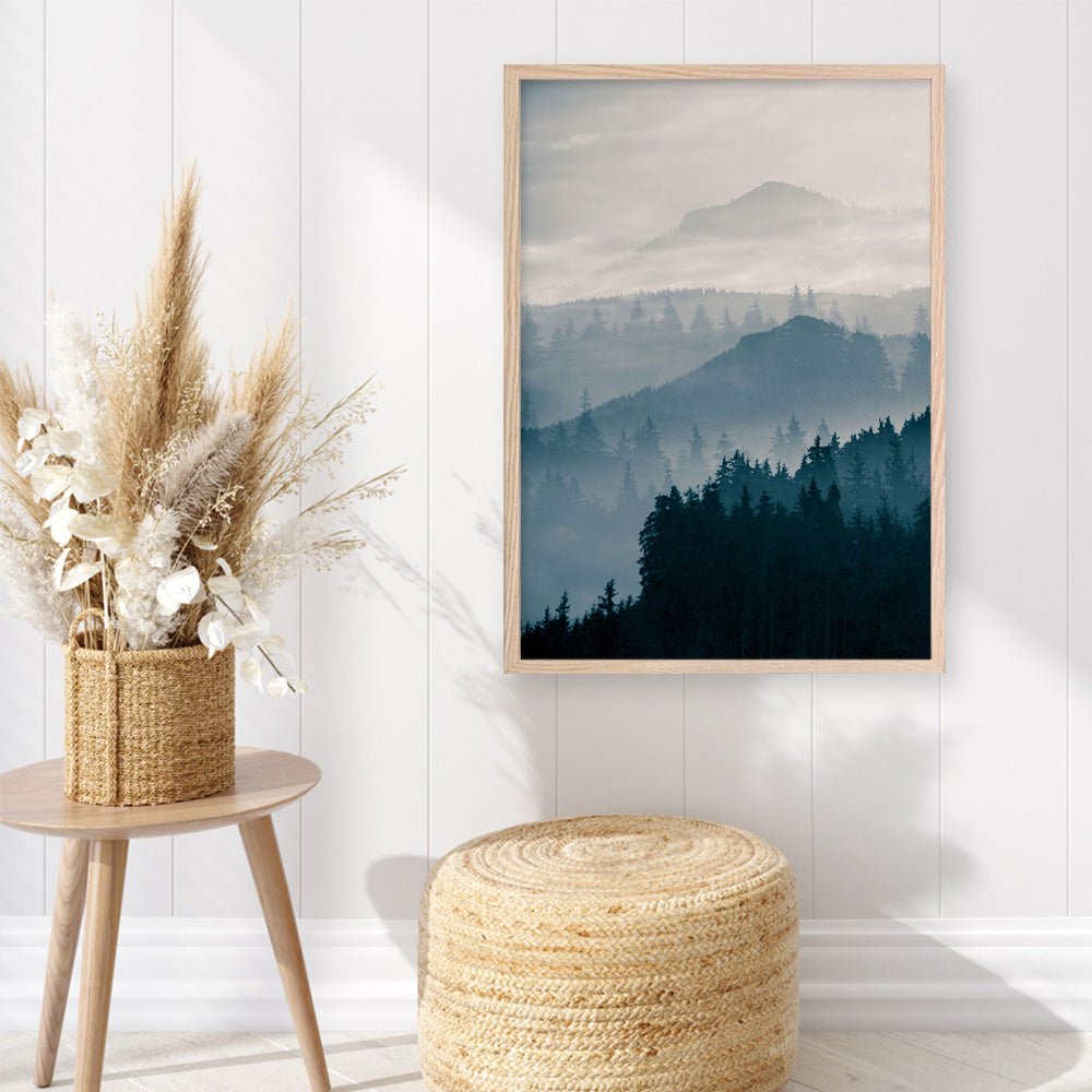 Shop Blue Mountains I Art Print by PhotoINC Studio and update your wall decor at home easily with this gloomy mountain silhouette artwork from our hand painted print collection.