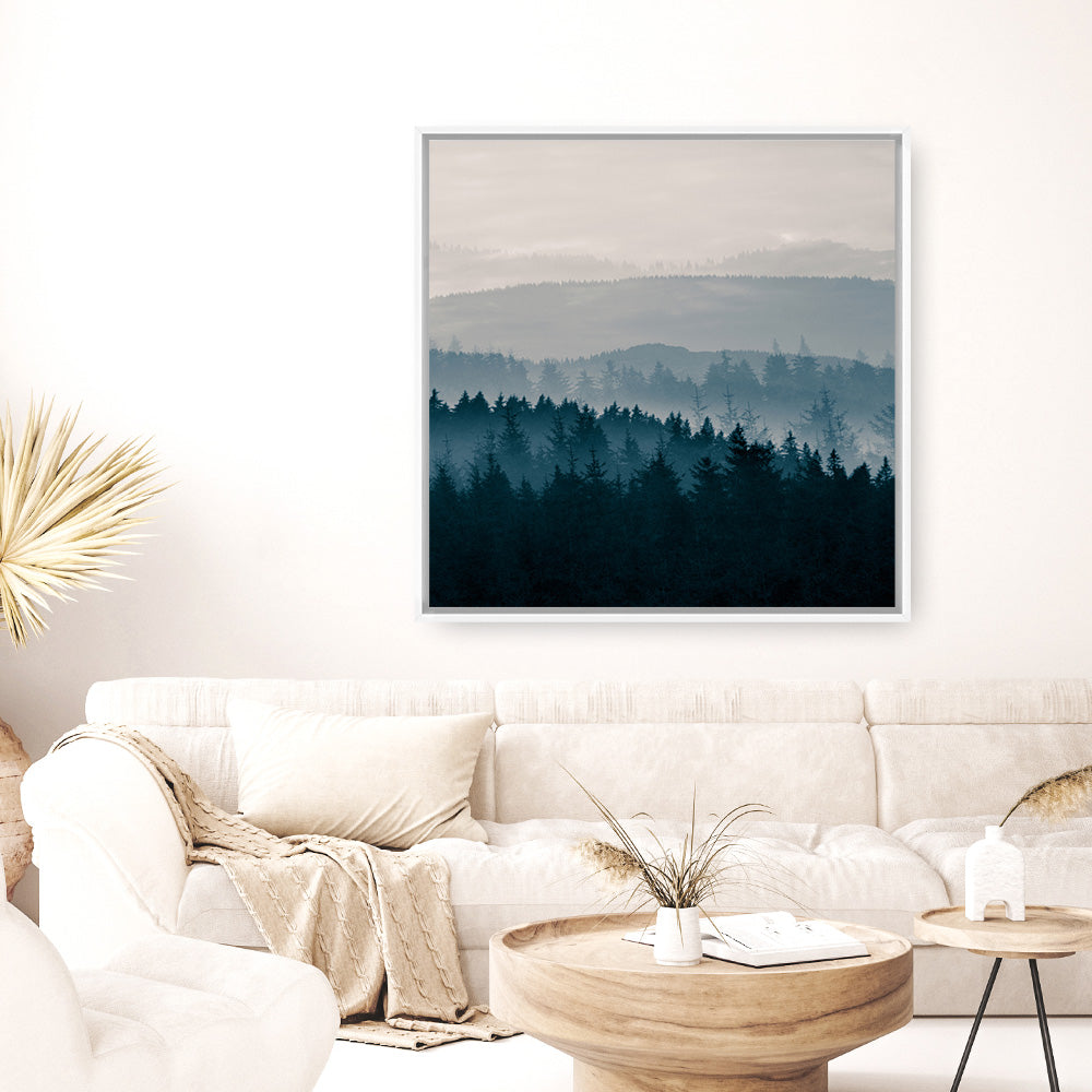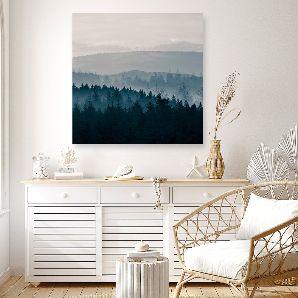 Shop Blue Mountains I! (Square) Canvas Print by PhotoINC Studio and update your wall decor at home easily with this gloomy mountain silhouette square artwork from our hand painted canvas print collection.