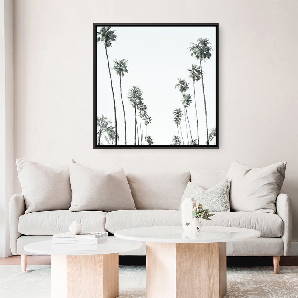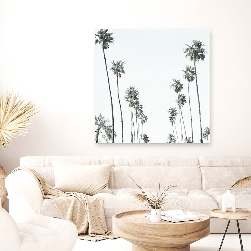 Shop California Palms II (Square) Canvas Print by The Print Emporium and update your wall decor at home easily with this artwork from our hand painted print collection.