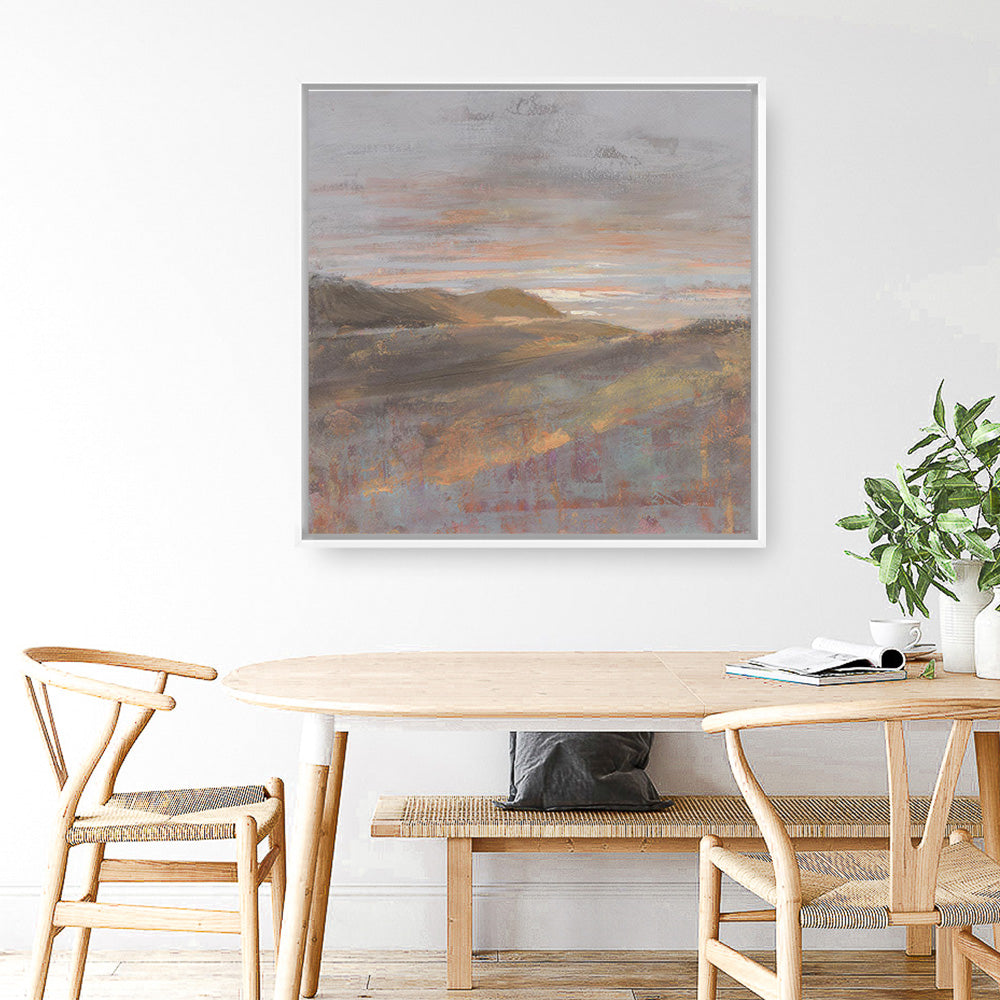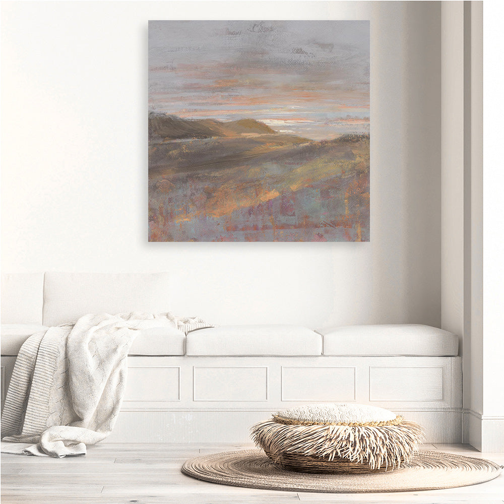 Shop Dawn on the Hills Light (Square) Canvas Wall Art Print by Danhui Nai and update your wall decor at home easily with this contemporary painting of a sunrise stretched framed artwork from our hand painted canvas print collection.