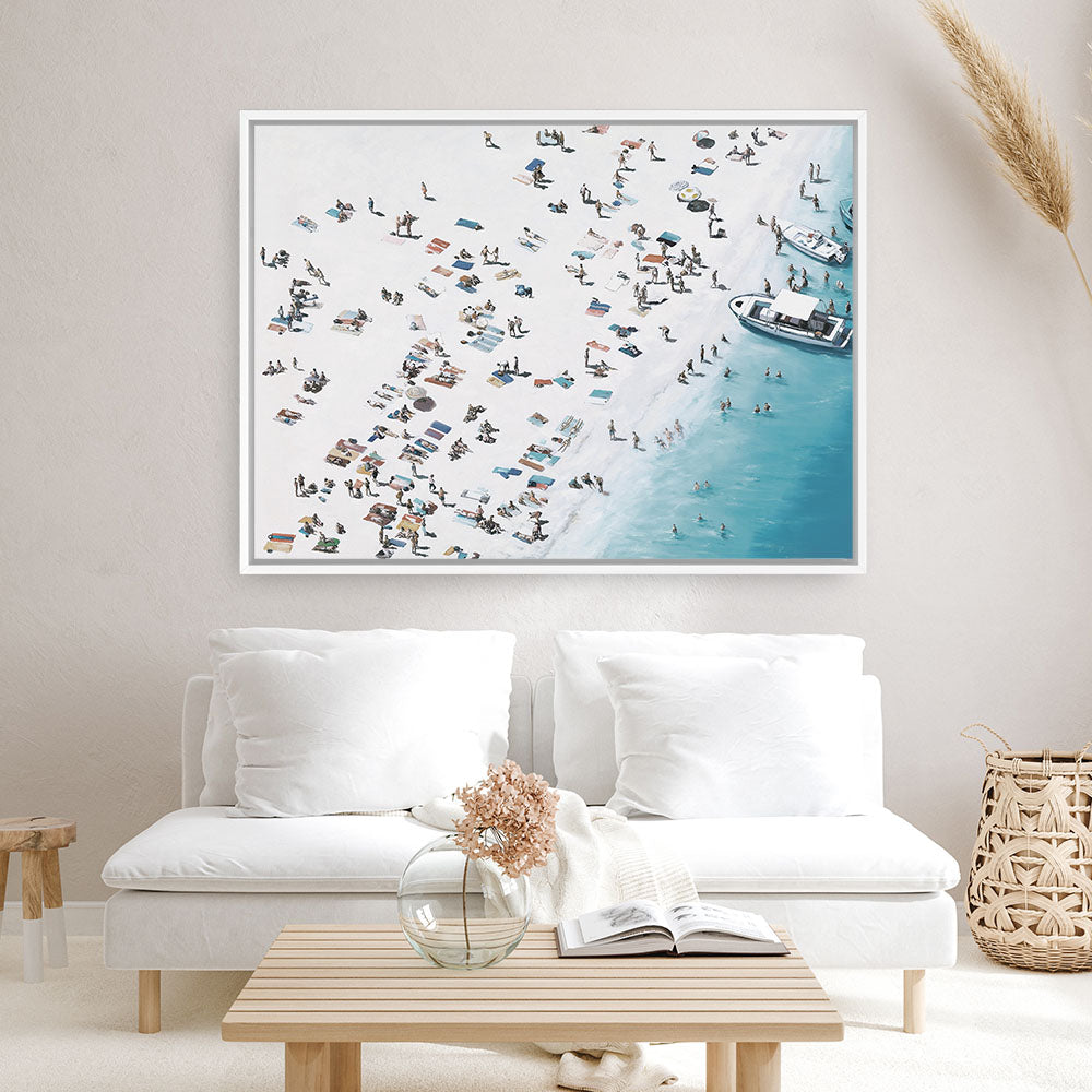 Shop Day At The Beach Canvas Print by The Print Emporium. This coastal aerial beach themed canvas wall art print from our hand painted aesthetic print collection, was originally hand painted by us and is now available as a reproduction printed stretched and ready-to-hang canvas artwork.