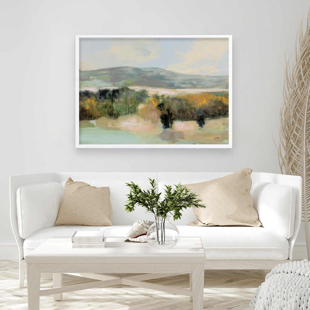 Shop Distant Mountain Art Print by Julia Purinton and update your wall decor at home easily with this beautiful view of a mountain and river from our abstract hand painted print collection.