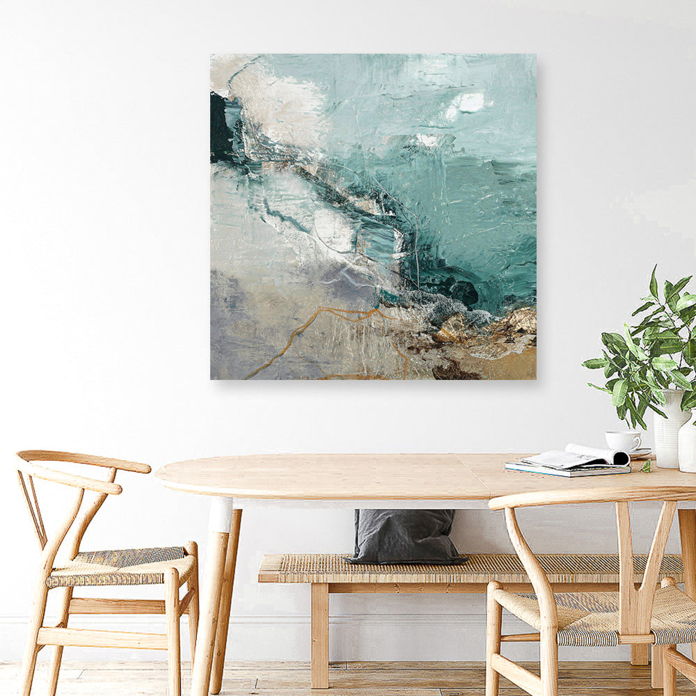 Shop Downhill (Square) Canvas Print by Design Fabrikken and update your wall decor at home easily with this green and gold abstract square artwork from our hand painted canvas print collection.