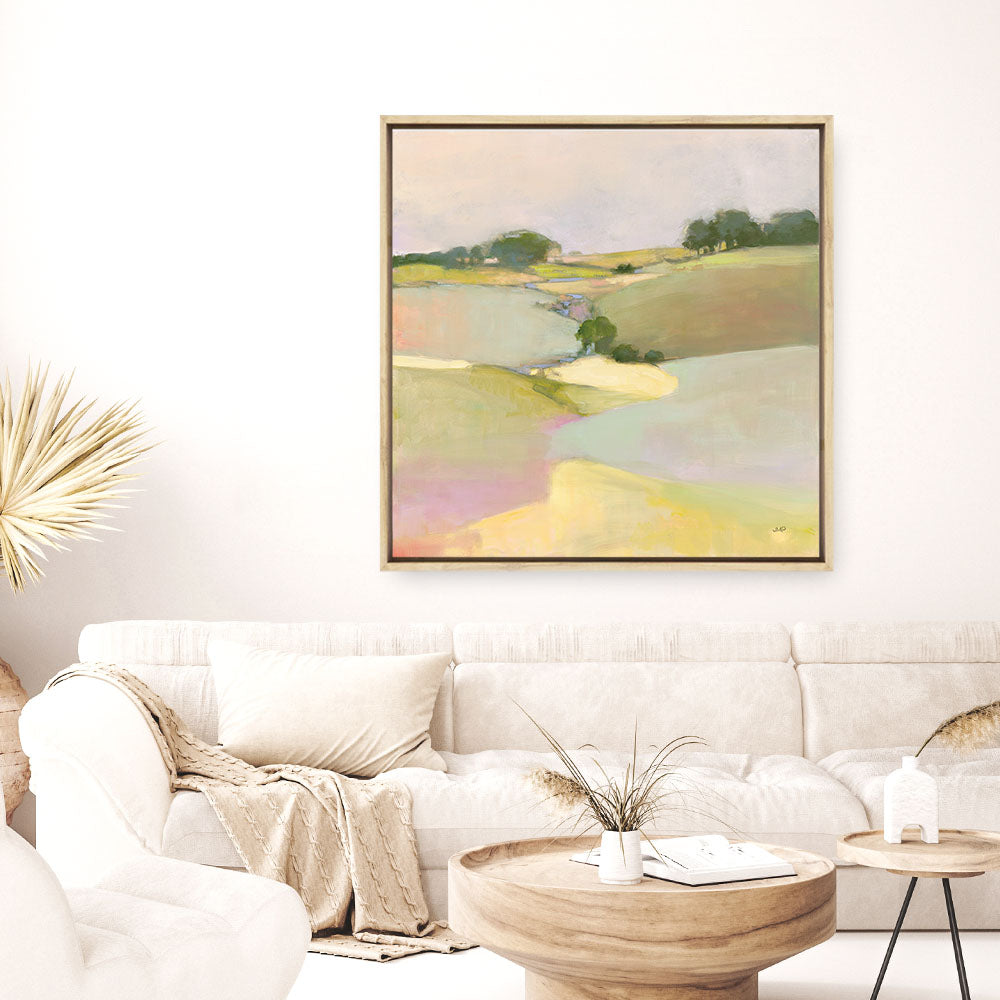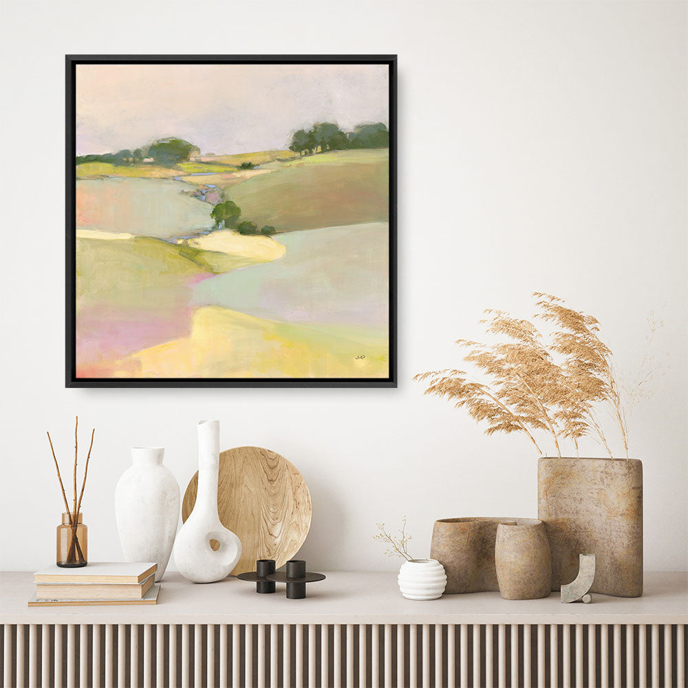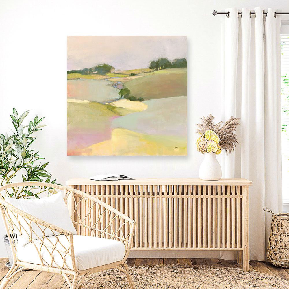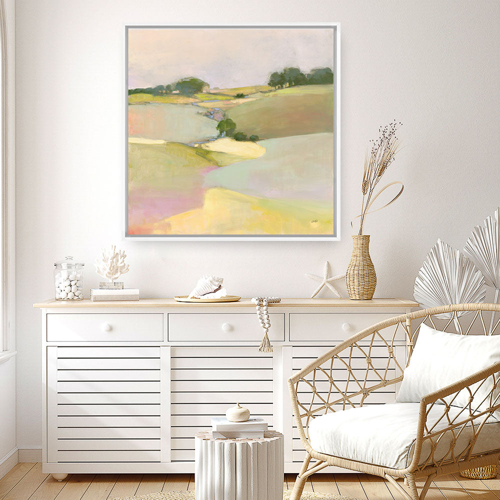 Shop Dream Valley II (Square) Canvas Wall Art Print by Julia Purinton and update your wall decor at home easily with this green toned abstract landscape themed stretched framed artwork from our hand painted canvas print collection.