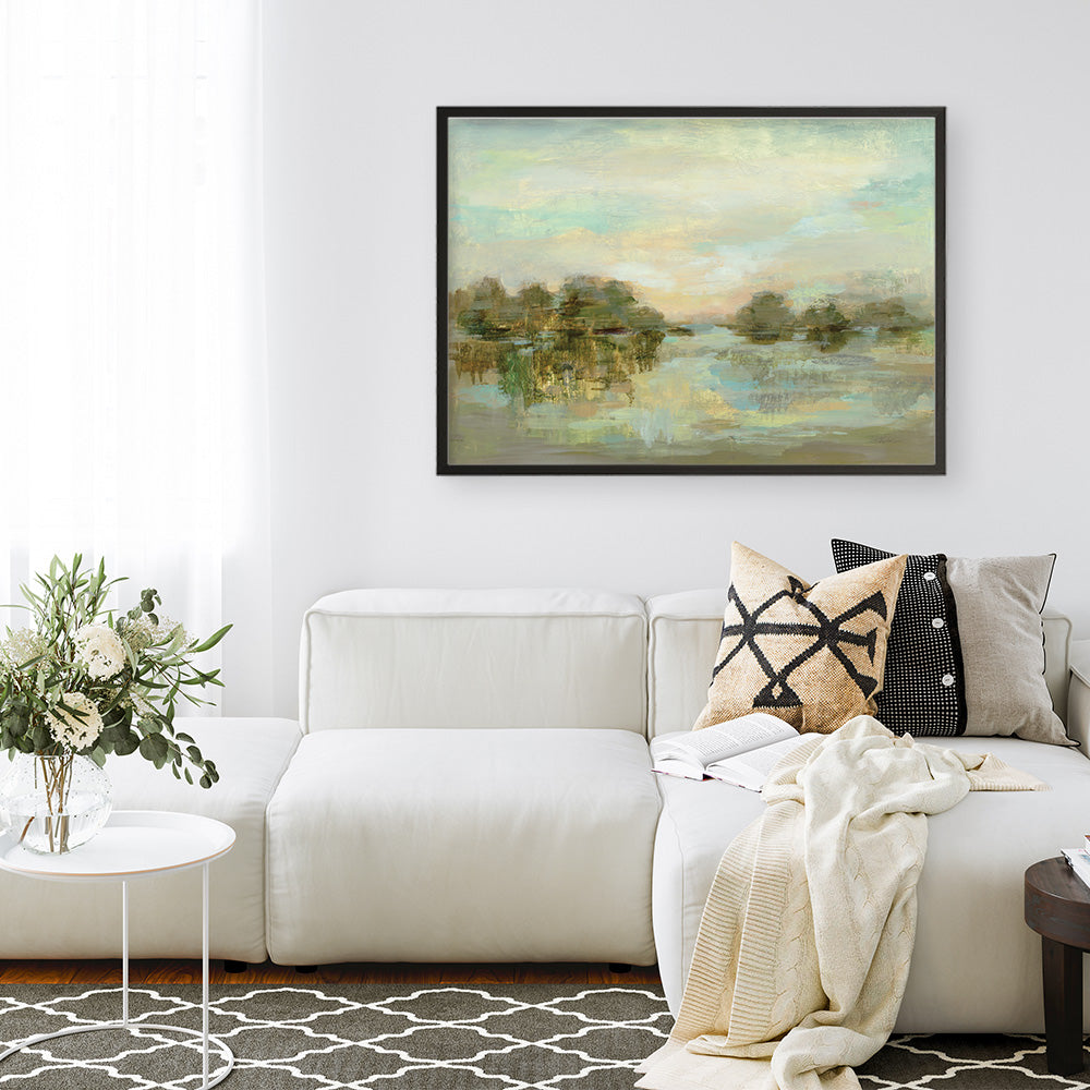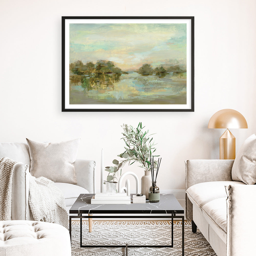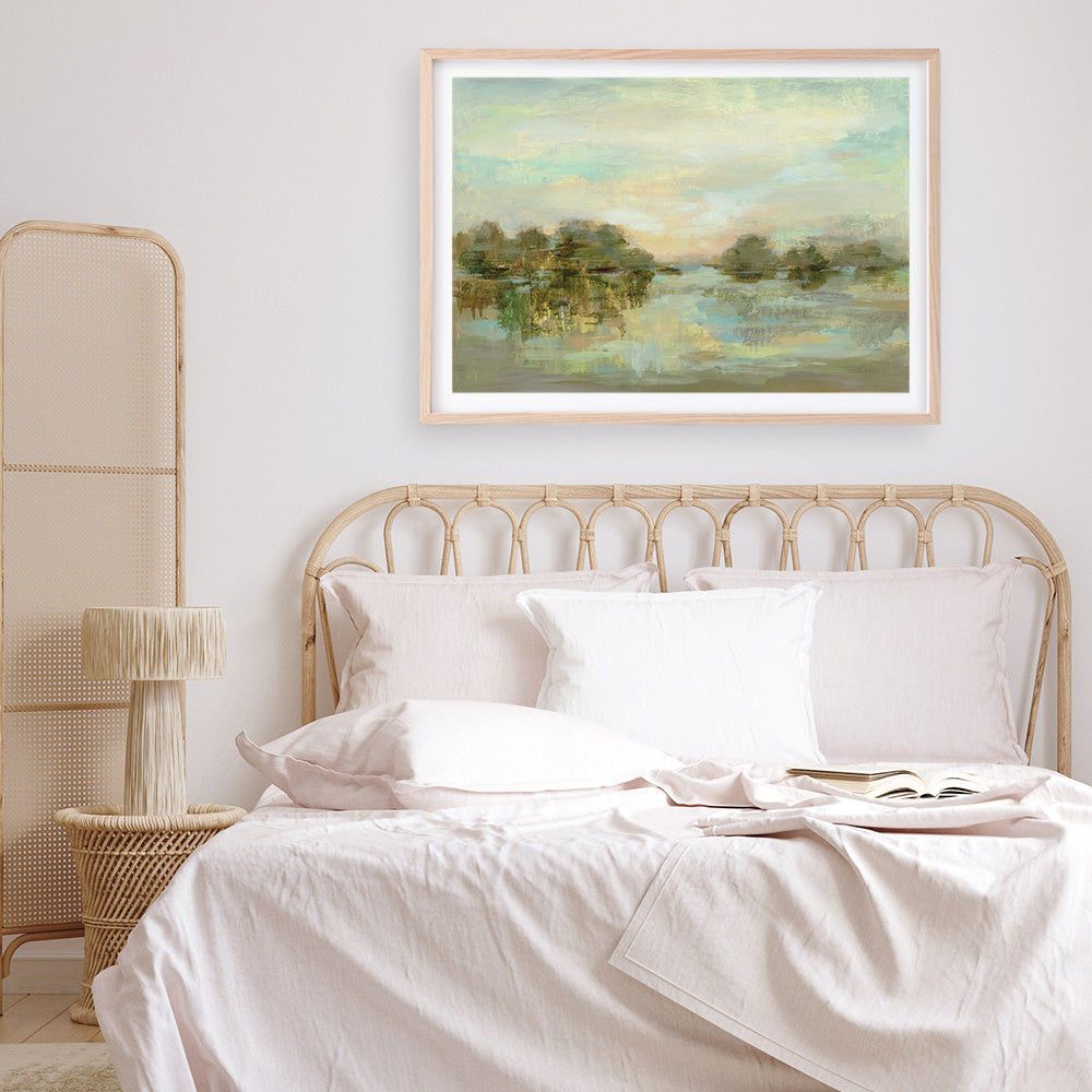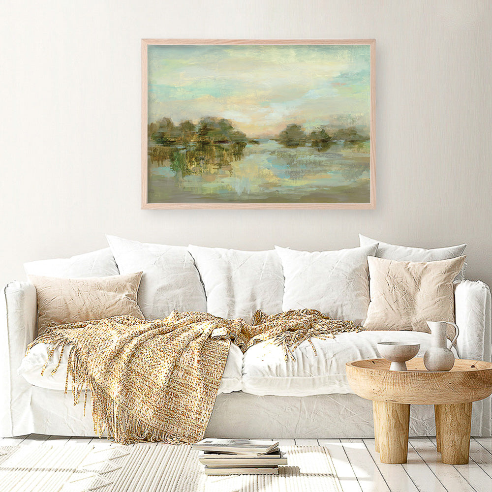 Shop Dreamy Lake Green Wall Art Print by Silvia Vassileva and update your wall decor at home easily with this green toned abstract landscape themed wall artwork print from our hand painted prints collection.