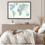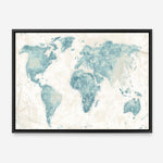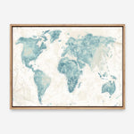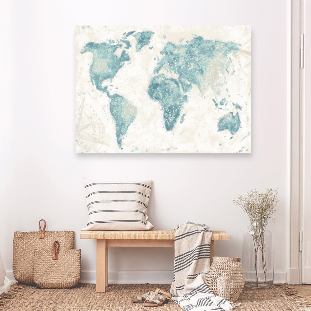 Shop Explore the World I no Words Light Canvas Print by Veronique Charron and update your wall decor at home easily with this turquoise coloured map of the world artwork from our abstract hand painted print collection .
