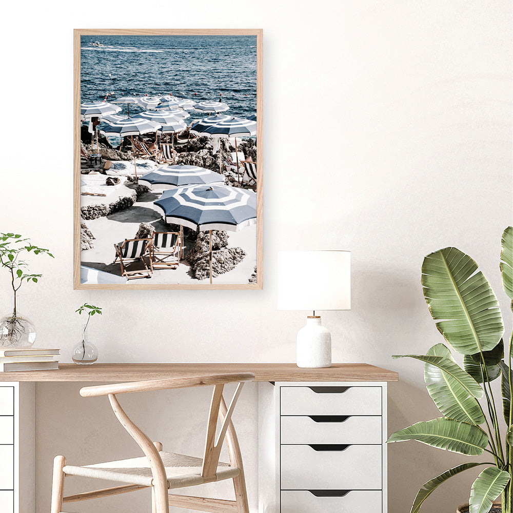 Shop Fontelina Views Photo Wall Art Print by The Print Emporium and update your wall decor at home easily with this blue Italy beach umbrella themed artwork print from our collection.