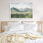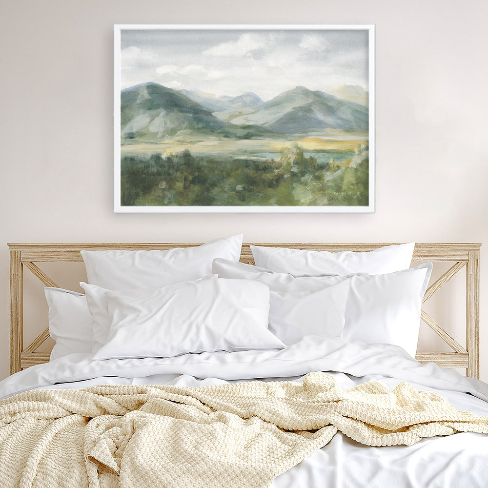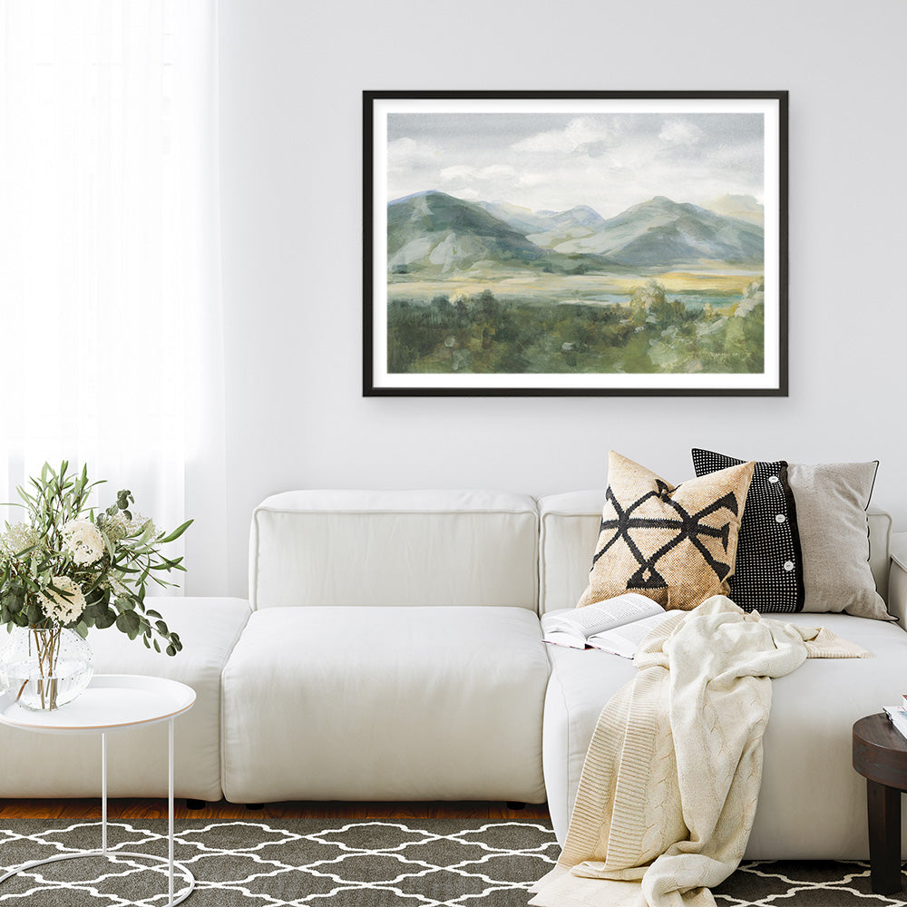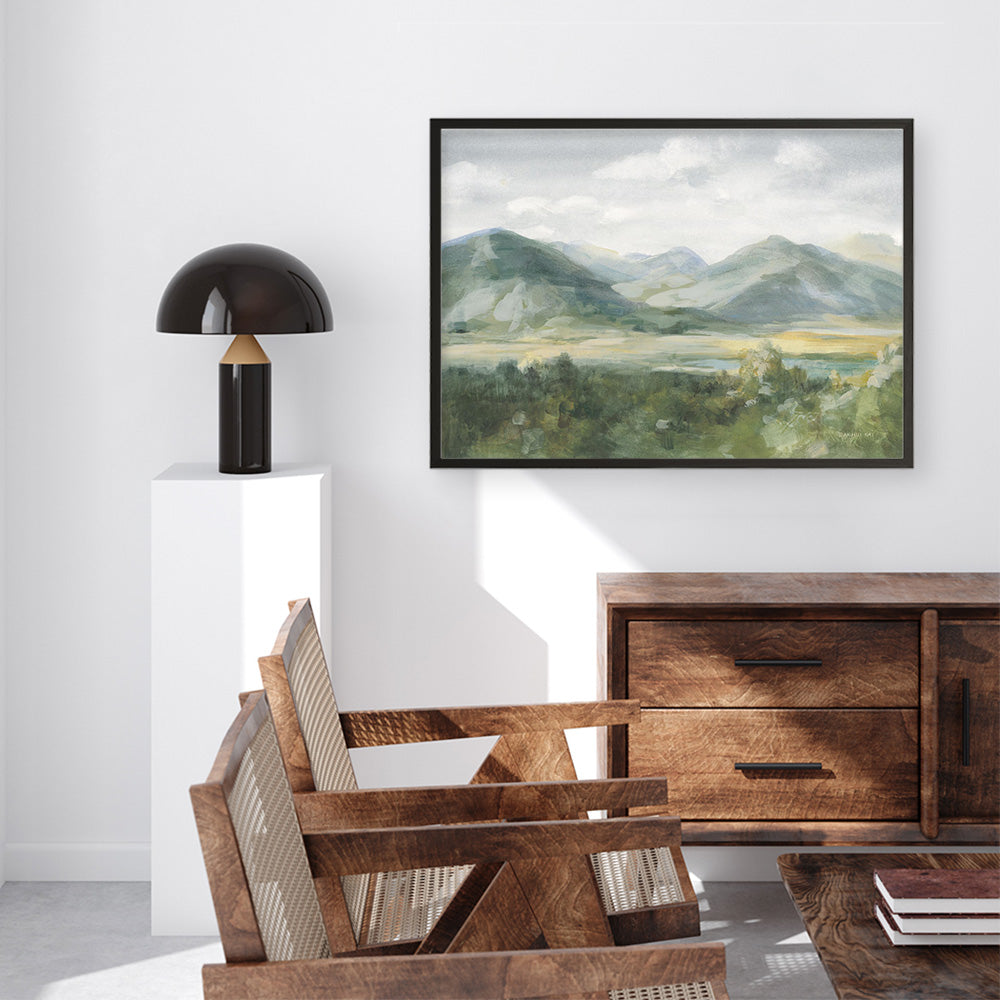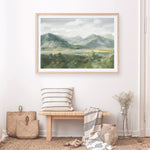 Shop Gateway Realm Sage Art Print by Danhui Nai and update your wall decor at home easily with this watercolour mountain and field view artwork from our abstract hand painted print collection.