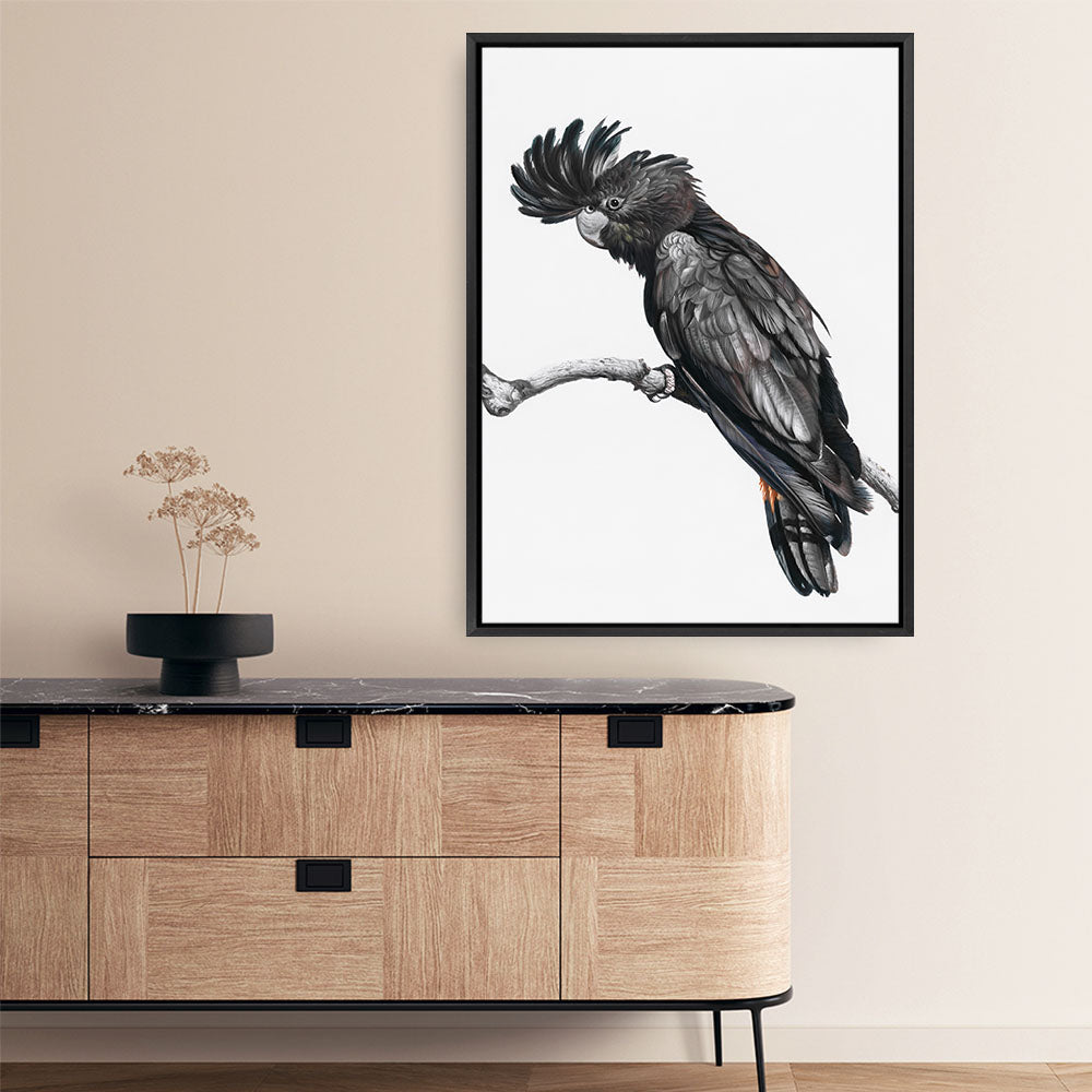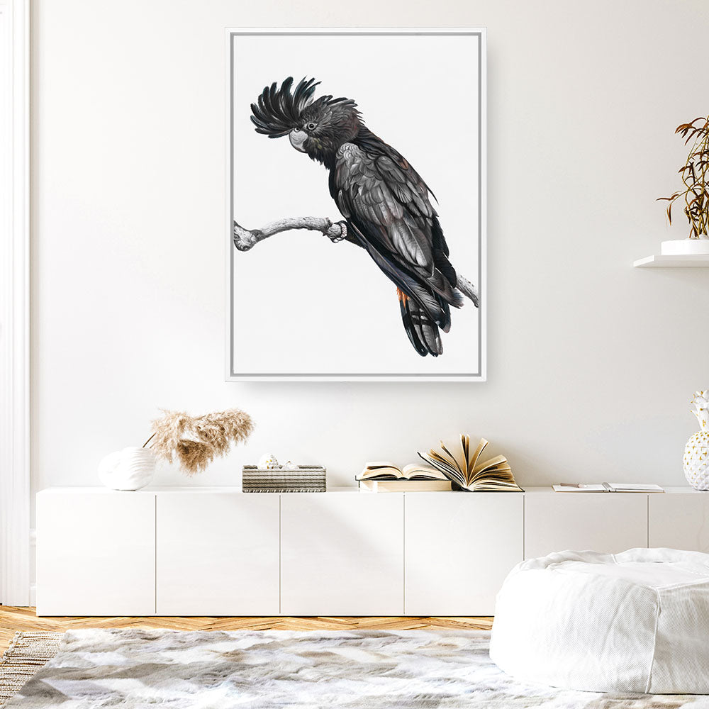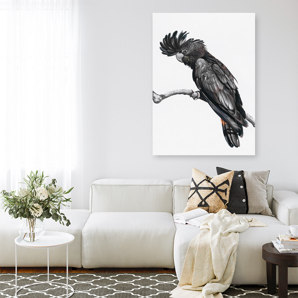 Shop George The Black Cockatoo (White) Canvas Print by The Print Emporium. This canvas wall art print from our hand painted aesthetic print collection, was originally hand painted by us and is now available as a reproduction printed stretched and ready-to-hang canvas artwork.