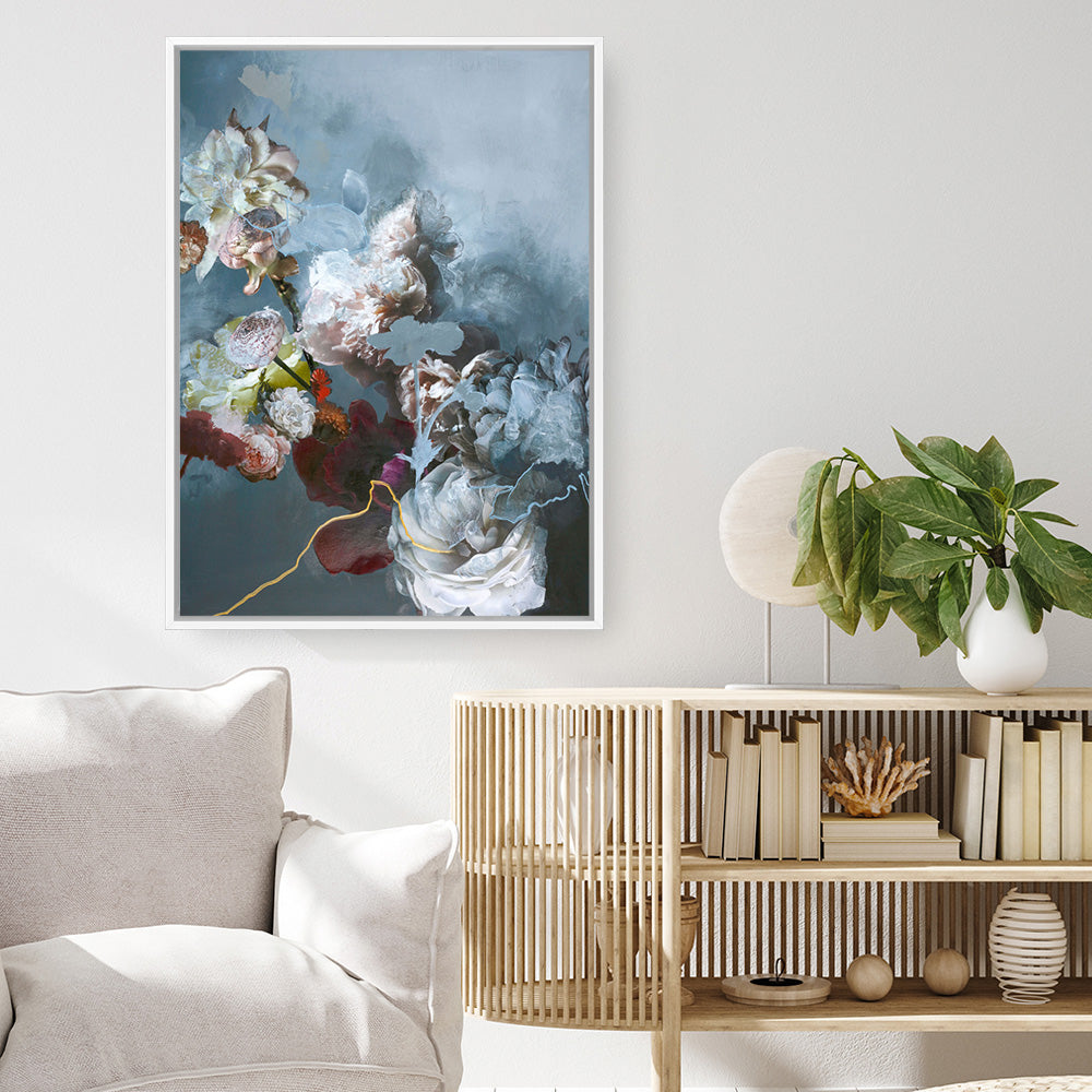 Shop Haute Couture Blue Canvas Print by Design Fabrikken and update your wall decor at home easily with this moody floral bouquet artwork from our hand painted canvas print collection.