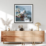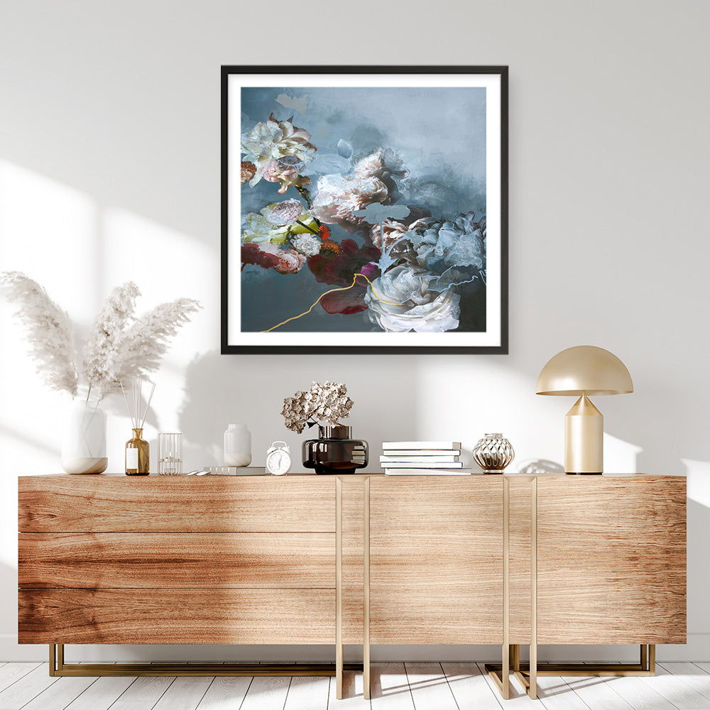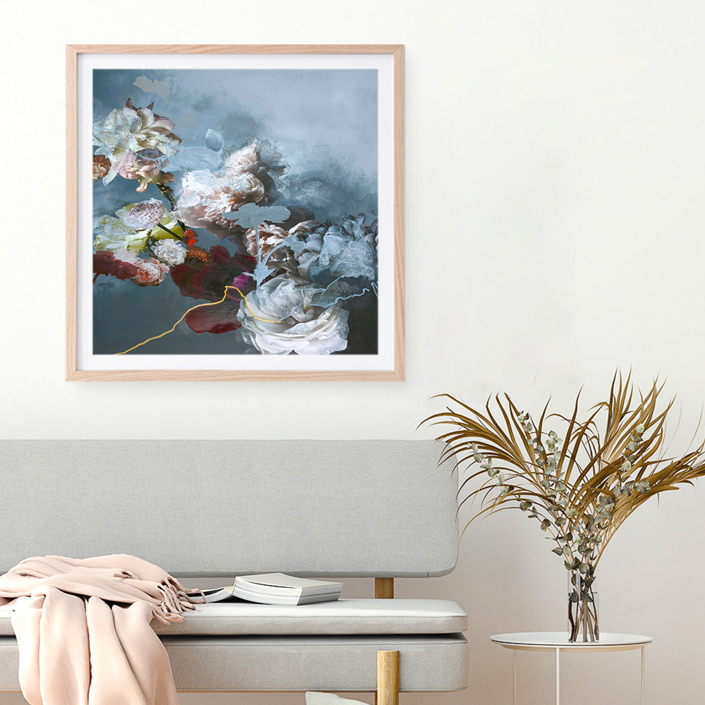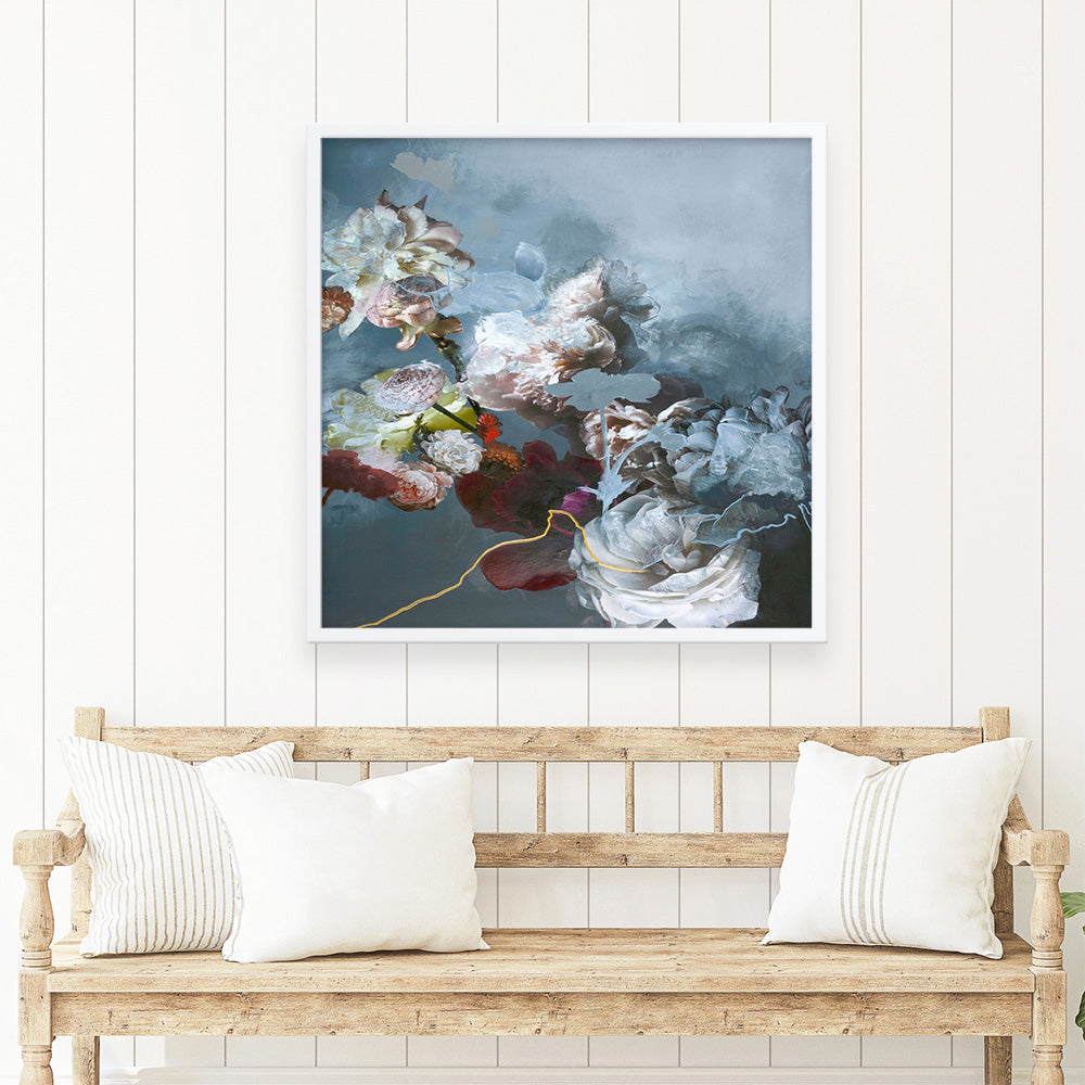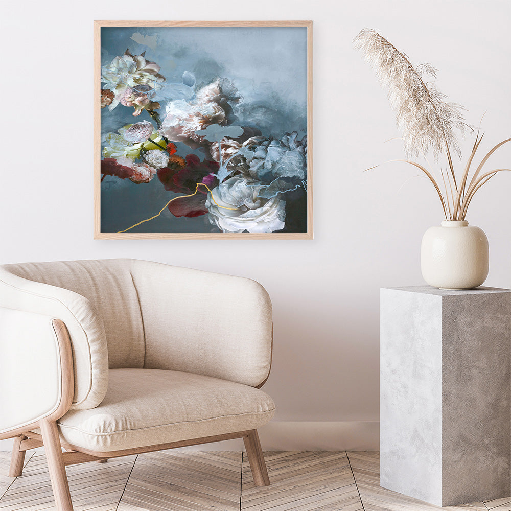 Shop Haute Couture Blue (Square) Art Print by Design Fabrikken and update your wall decor at home easily with this moody floral bouquet square artwork from our hand painted print collection.