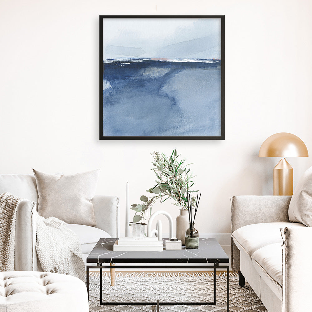 Shop Horizon 38 (Square) Art Print by M. Gloria Hunter and update your wall decor at home easily with this blue horizon abstract square artwork from our hand painted print collection.