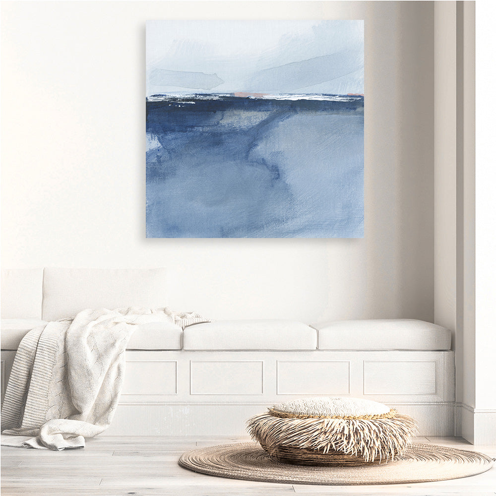Shop Horizon 38 (Square) Canvas Print by M. Gloria Hunter and update your wall decor at home easily with this blue horizon abstract square artwork from our hand painted canvas print collection.