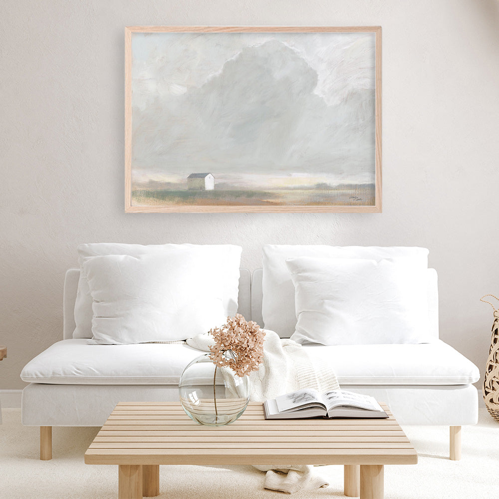Shop House in the Mist Art Print by Wellington Studioand update your wall decor at home easily with this cloudy countryside landscape artwork from our abstract hand painted print collection.
