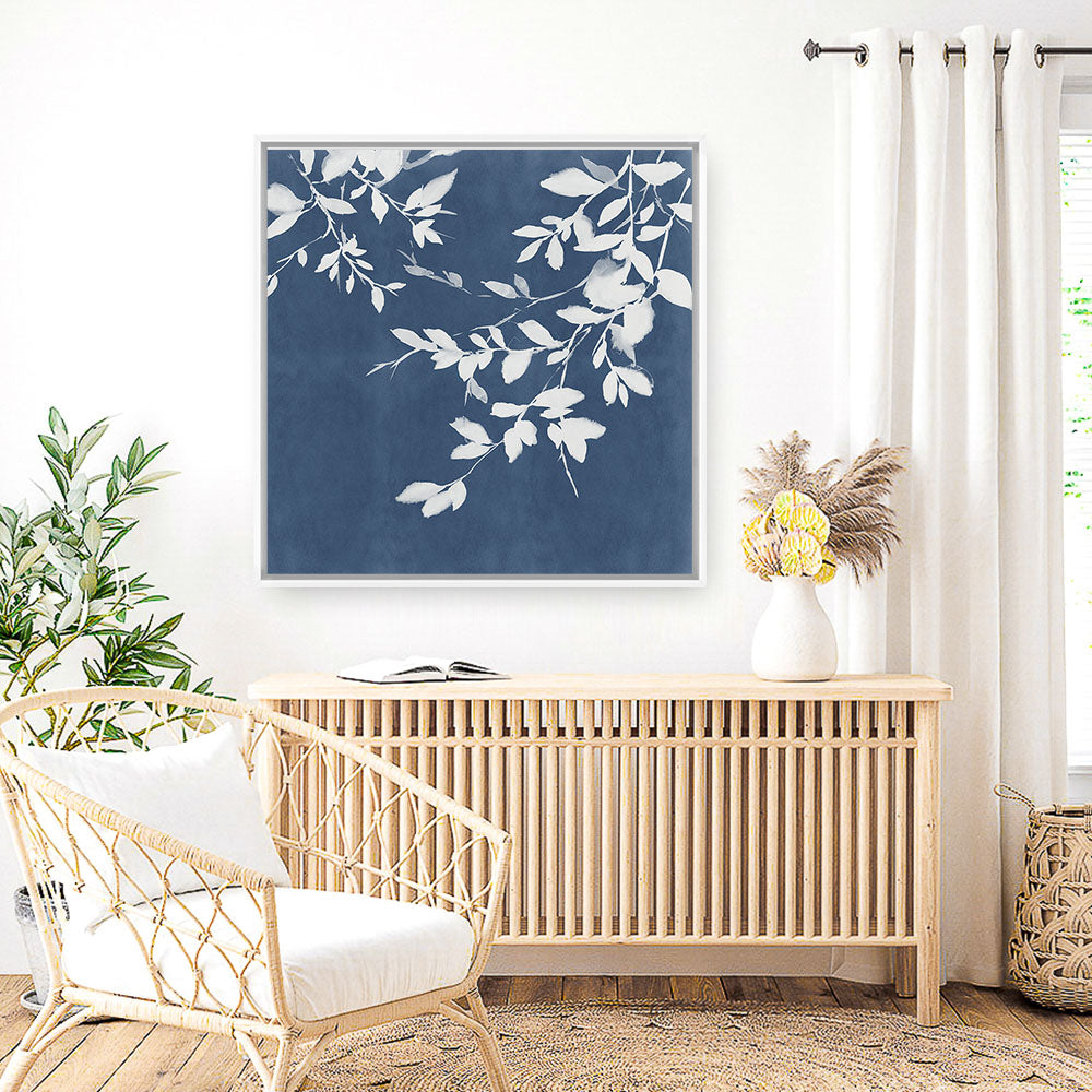 Shop Indigo Sky I (Square) Canvas Wall Art Print by Isabelle Z and update your wall decor at home easily with this blue and white botanical themed framed canvas artwork piece from our hand painted prints collection.