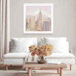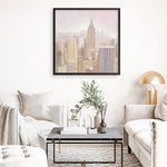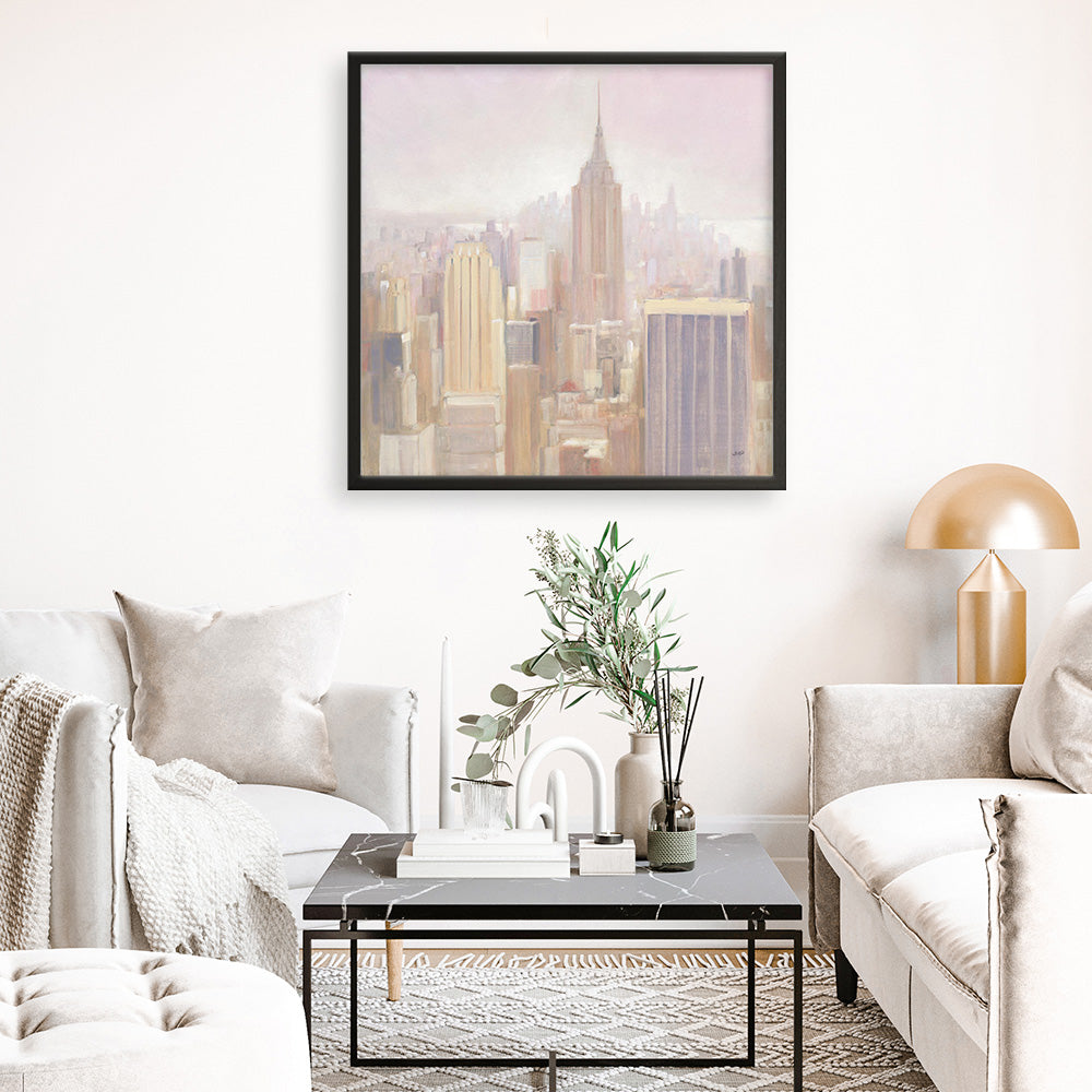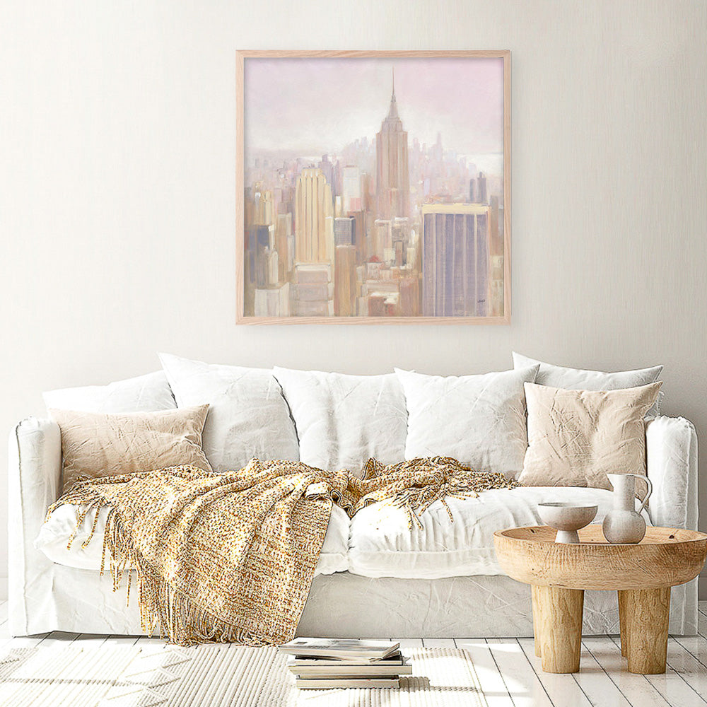 Shop Manhattan in the Mist (Square) Art Print by Julia Purinton and update your wall decor at home easily with this misty New York City skyline artwork print from our hand painted prints collection.