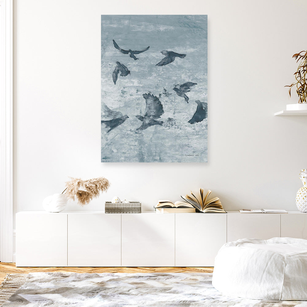 The Migration Blue Panel II artwork captures a tranquil moment of birds in flight, painted in layered blue and grey hues that evoke calm skies and open horizons. Its soft, abstract texture brings a sense of quiet movement and serenity to any room. Perfect for coastal, Scandinavian or minimalist interiors, this elegant piece adds depth and balance through its soothing tones and nature-inspired composition — a timeless statement for modern spaces.