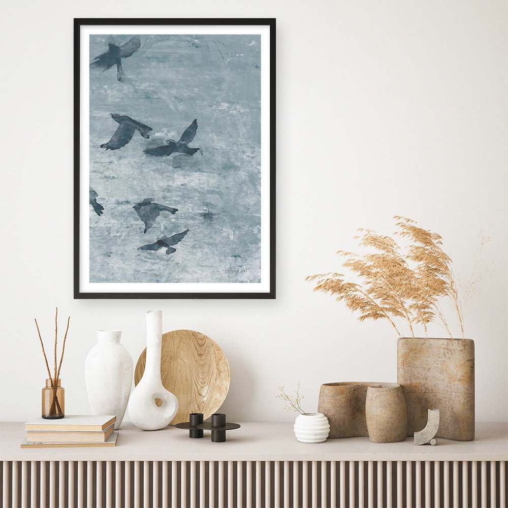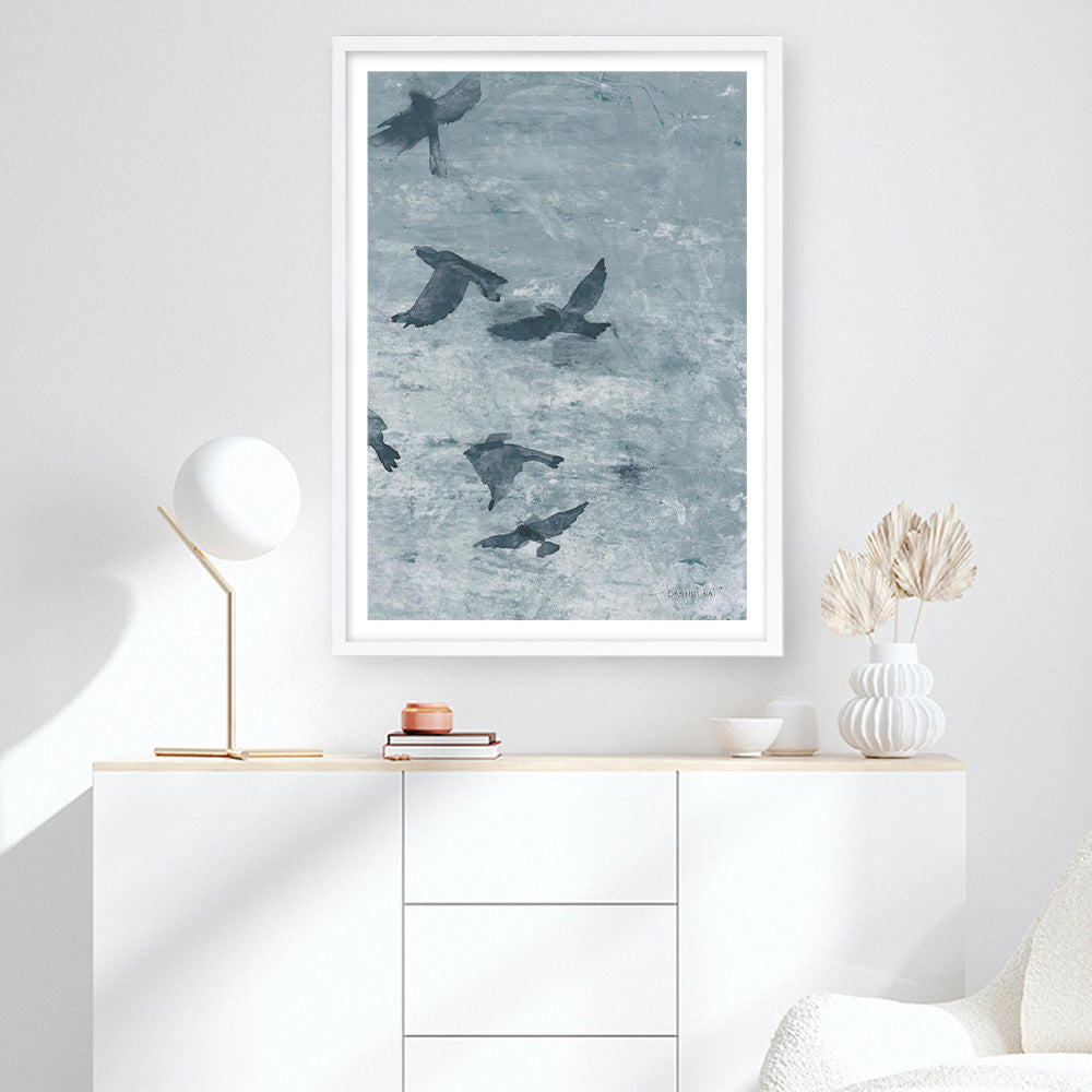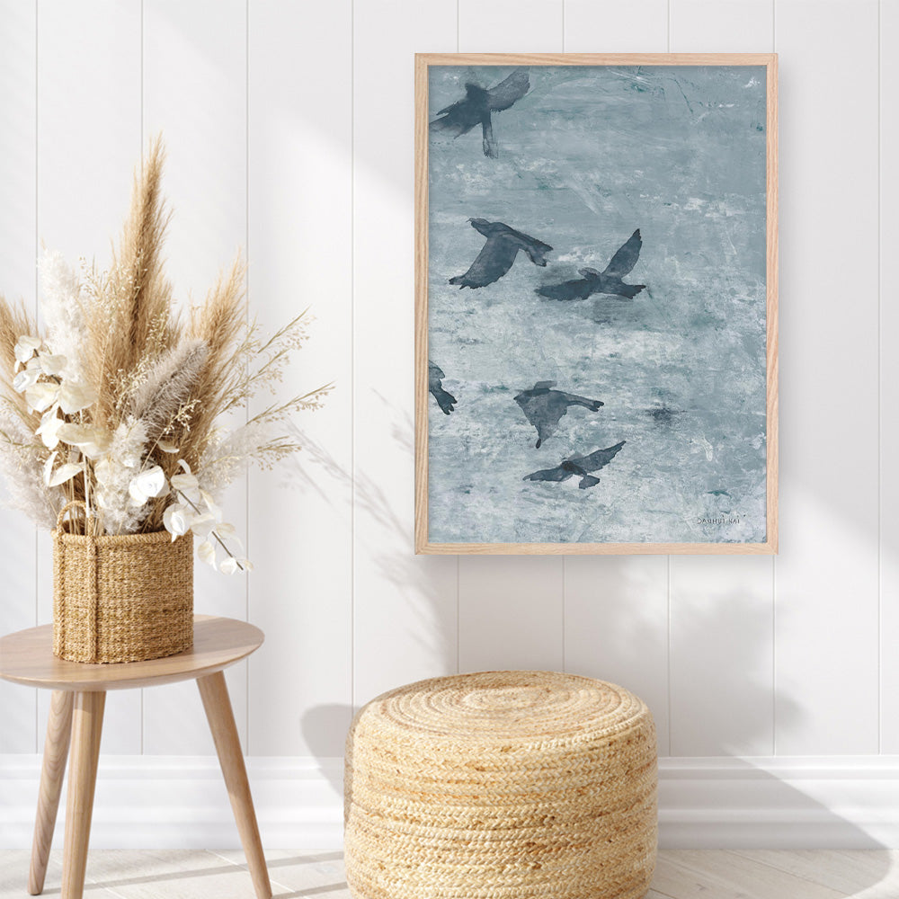 Shop Migration Blue Panel IIIArt Print by Danhui Naiand update your wall decor at home easily with this bird themed artwork from our abstract hand painted print collection.