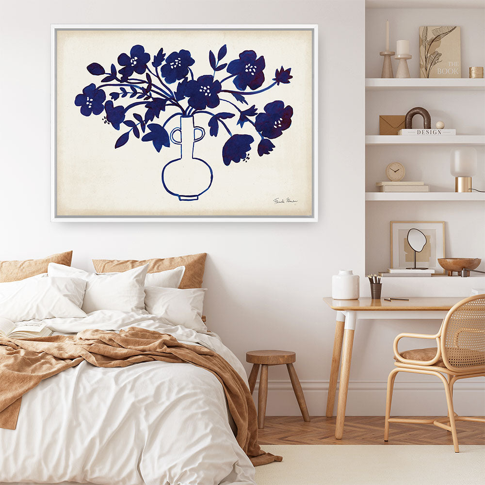 Shop Modern Blue I Canvas Print by Farida Zaman and update your wall decor at home easily with this navy blue flower vase themed artwork from our hand painted print collection.