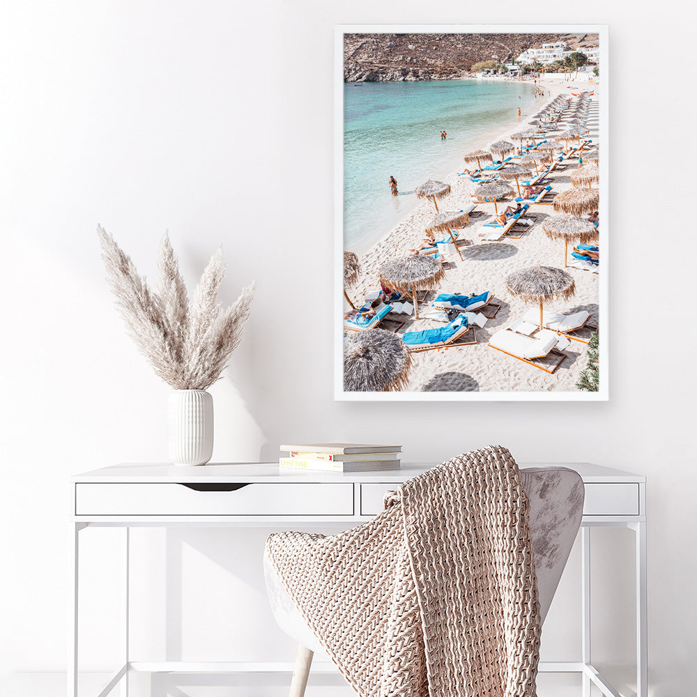 Shop Mykonos Beach III Photo Wall Art Print by The Print Emporium and update your wall decor at home easily with this Greek straw beach umbrella themed artwork print from our collection.