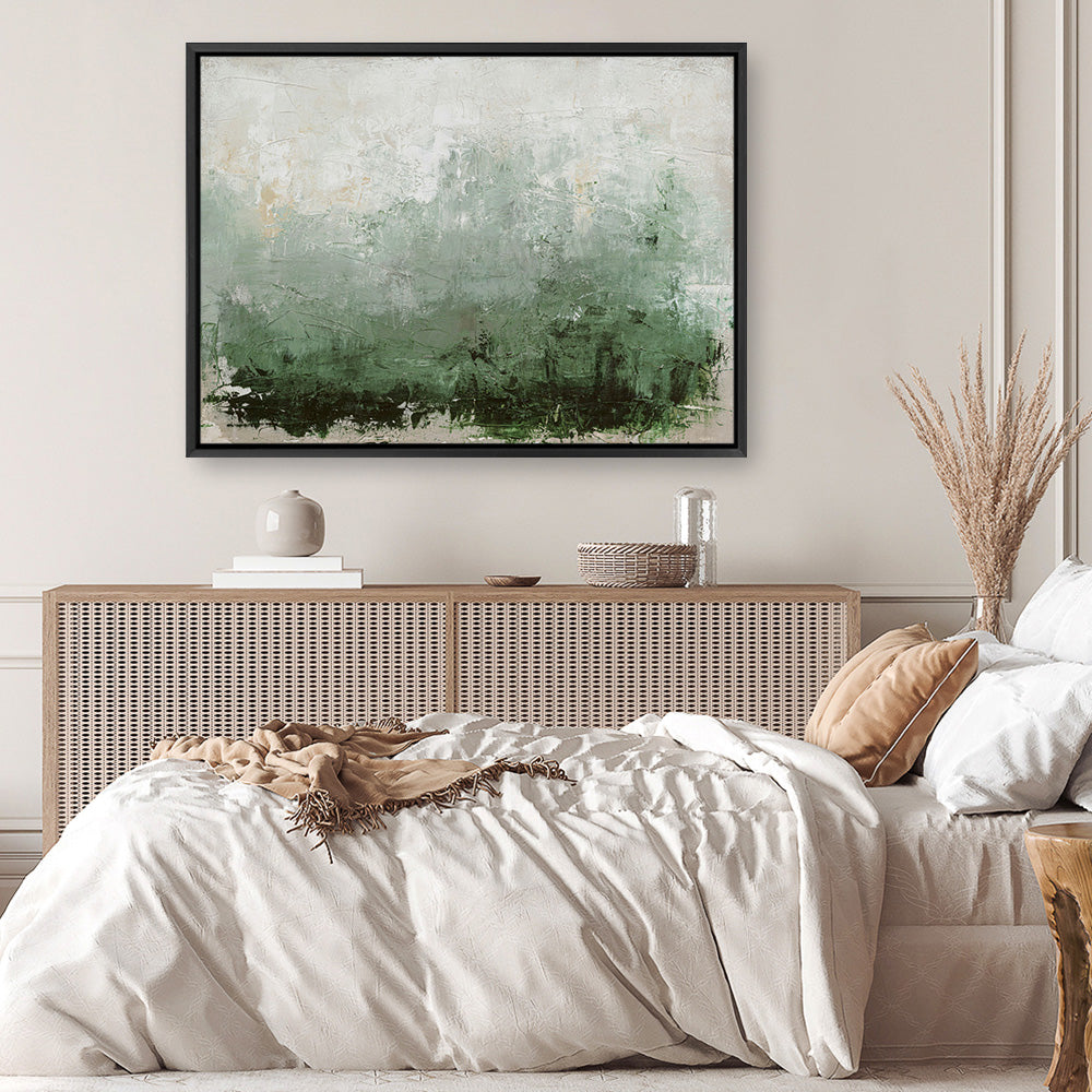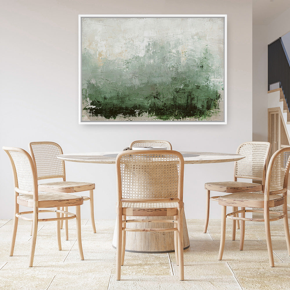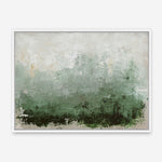 Shop New Story Canvas Print by Design Fabrikken and update your wall decor at home easily with this abstract art work that features rich layers of deep forest green fading into soft sage and misty whites print from our hand painted canvas print collection.