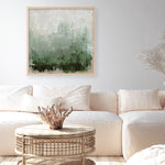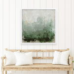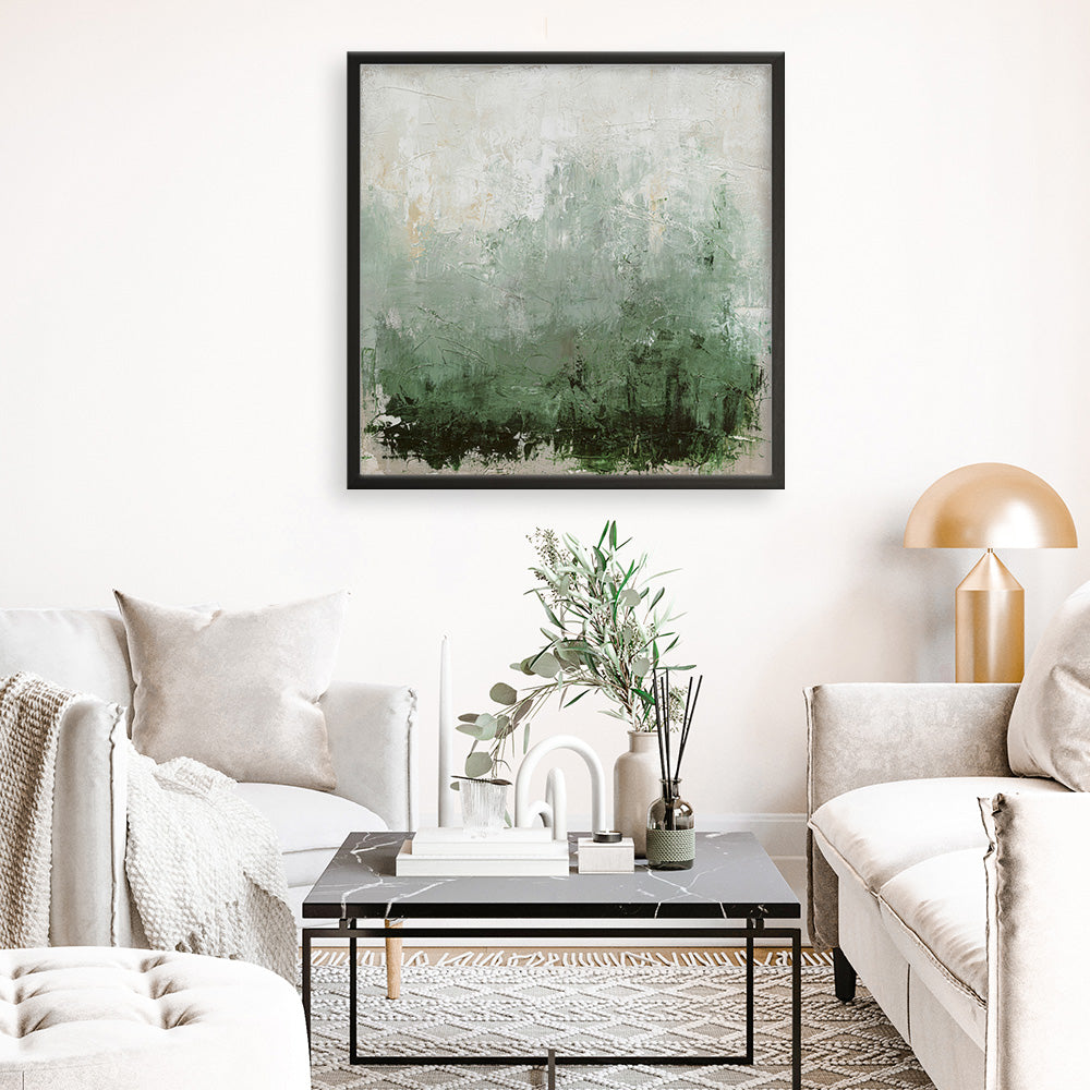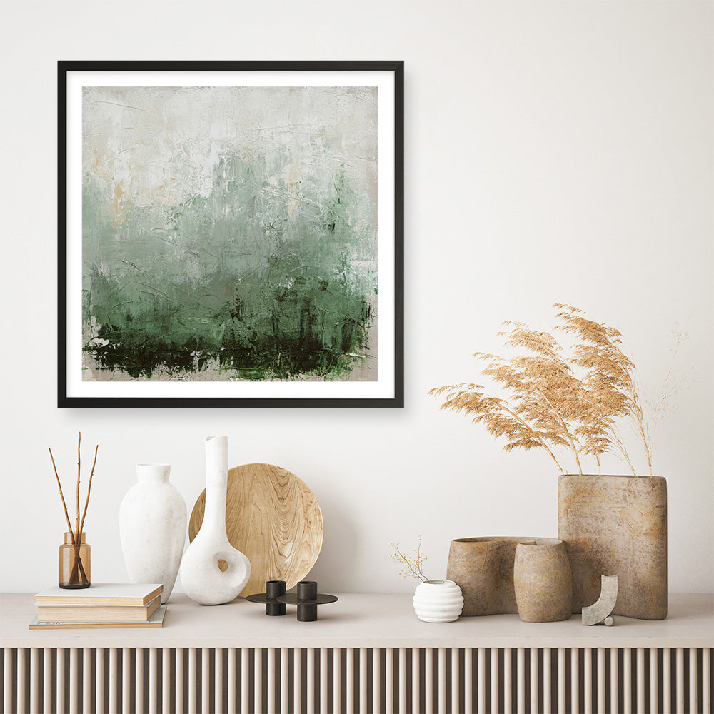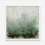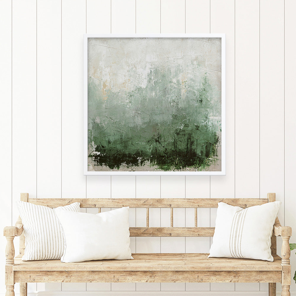 Shop New Story (Square) Art Print by Design Fabrikken and update your wall decor at home easily with this abstract square art work that features rich layers of deep forest green fading into soft sage and misty whites print from our hand painted print collection.