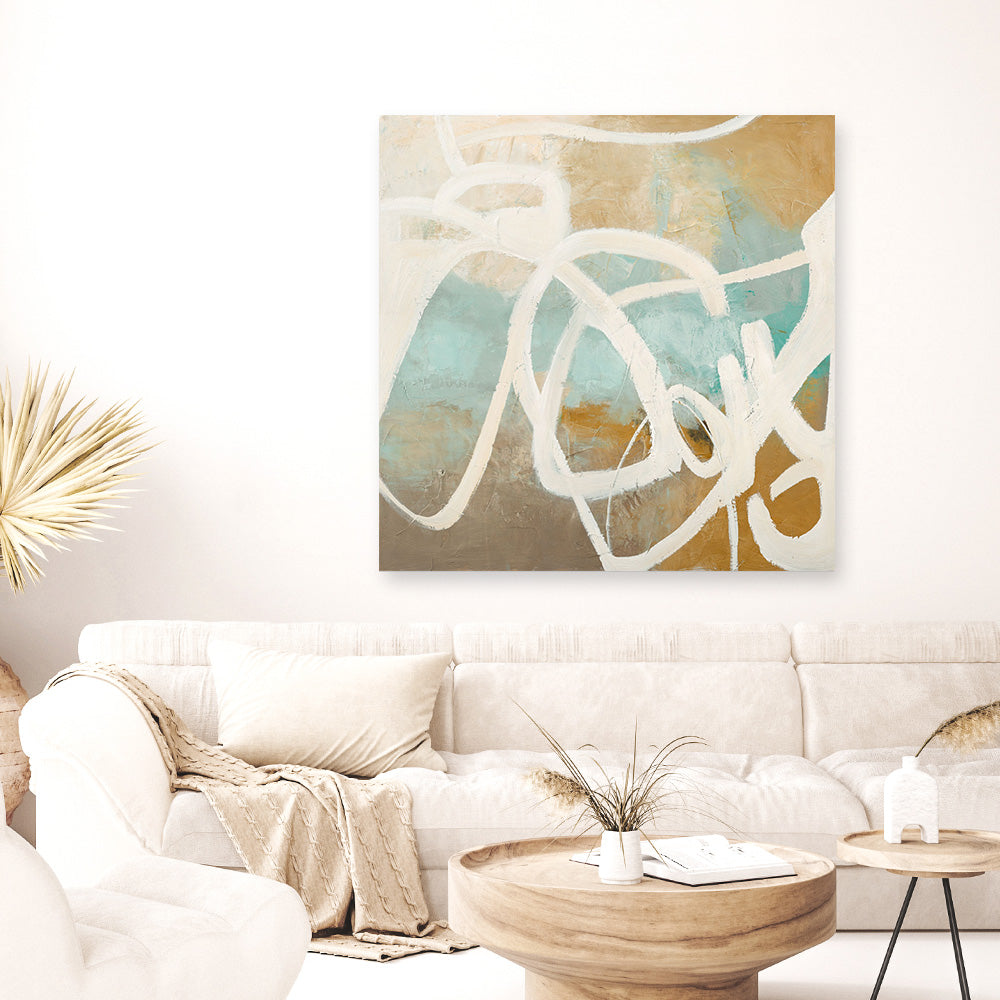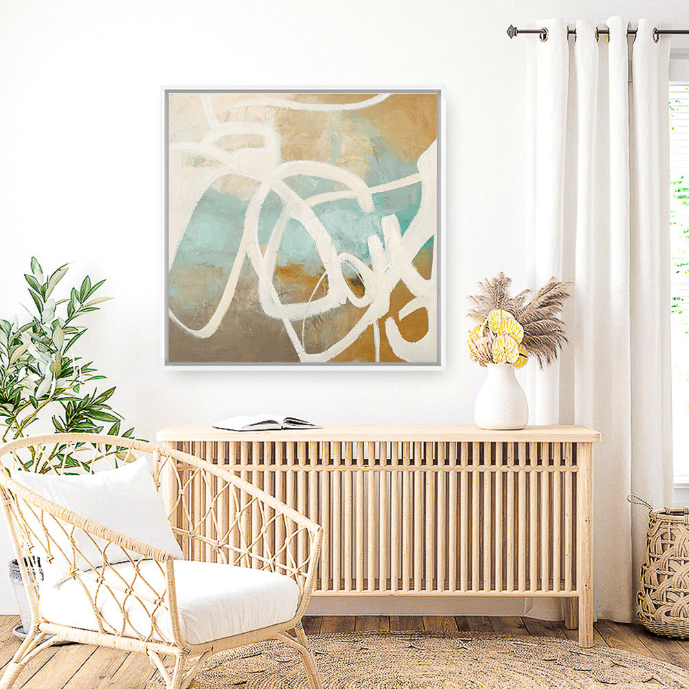 Shop Notify (Square) Canvas Print by Design Fabrikken and update your wall decor at home easily with this neutral and aqua-toned abstract square artwork from our hand painted canvas print collection.