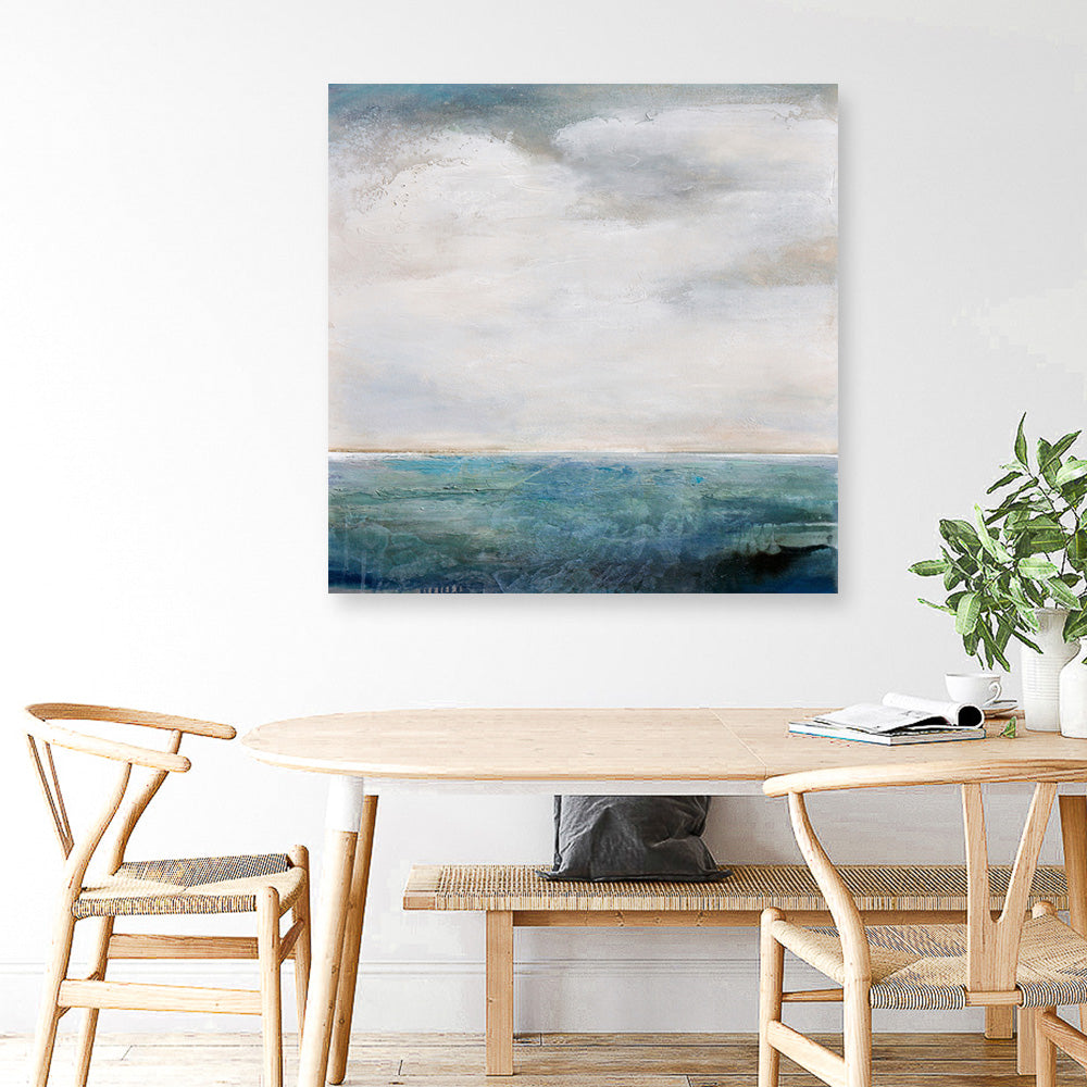Shop On The Edge (Square) Canvas Print by Karen Hale and update your wall decor at home easily with this moody ocean view square artwork from our hand painted canvas print collection.