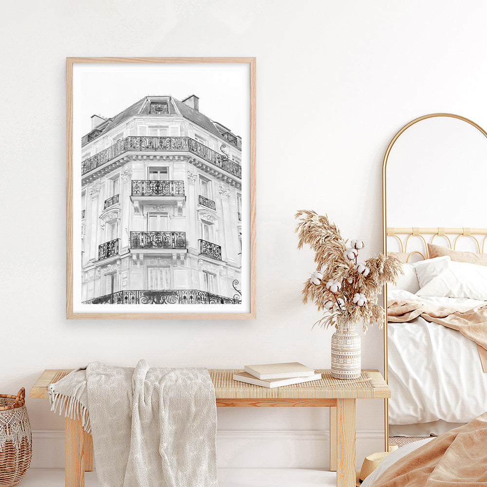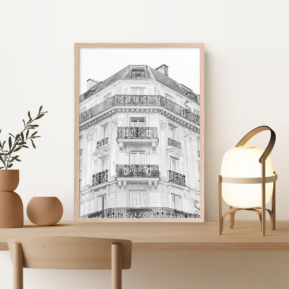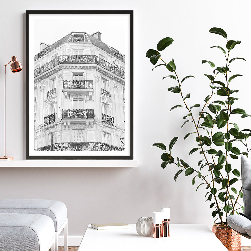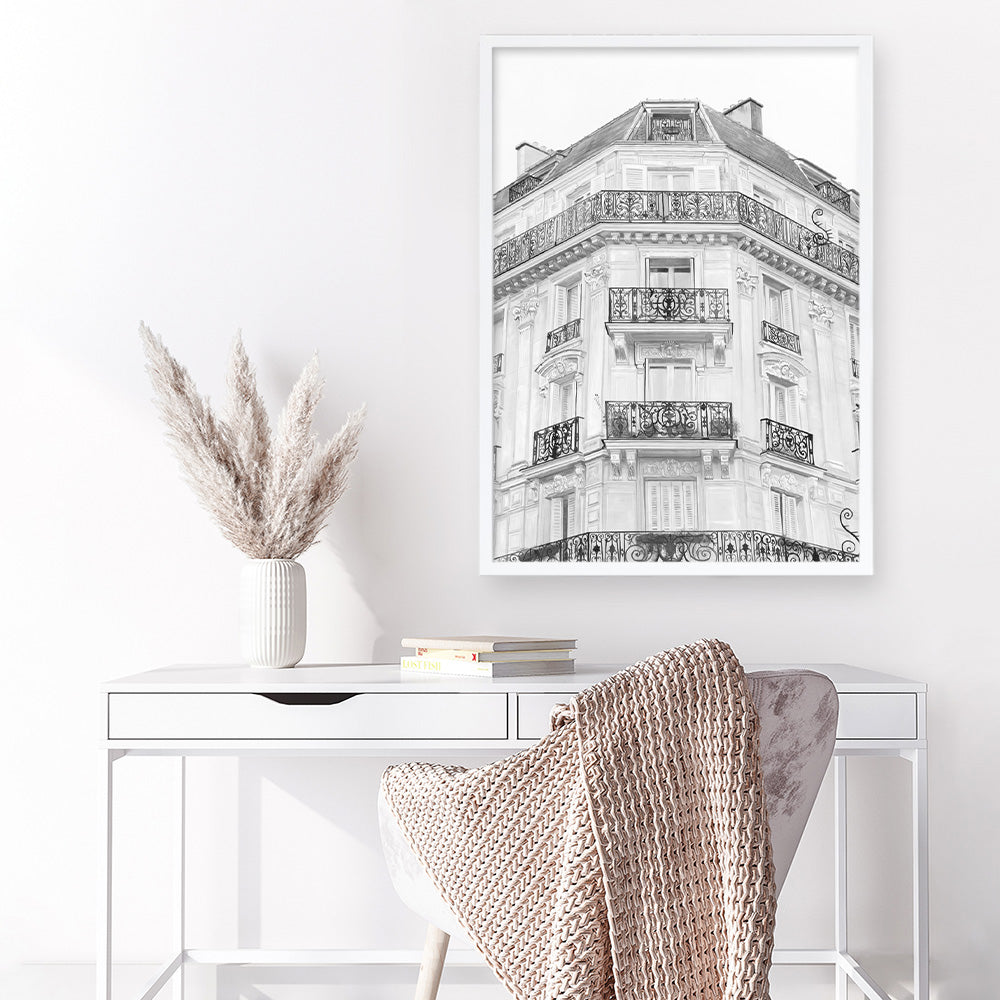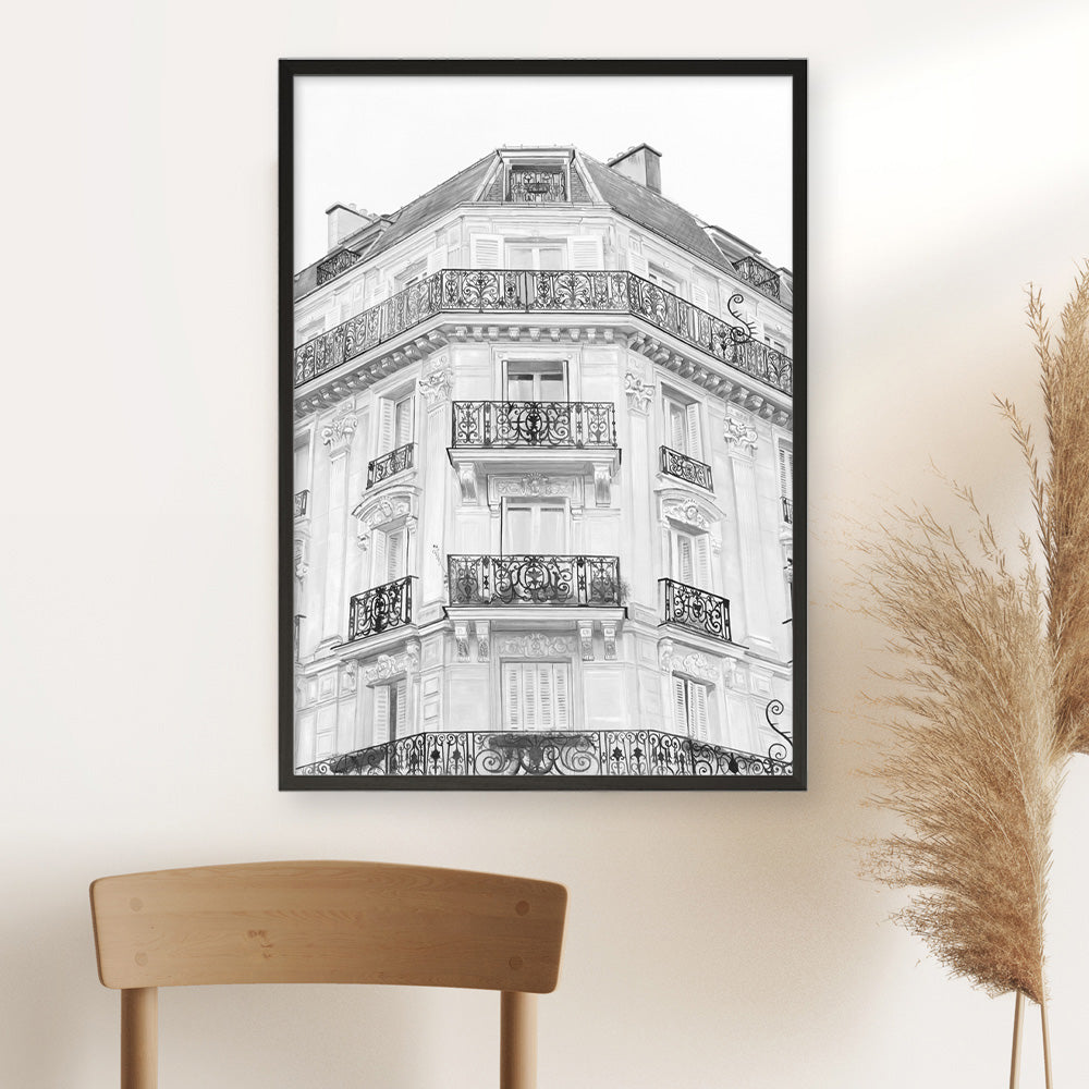 Shop Paris Building B&W I Art Print by The Print Emporium and update your wall decor at home easily with this artwork print from our hand painted print collection.