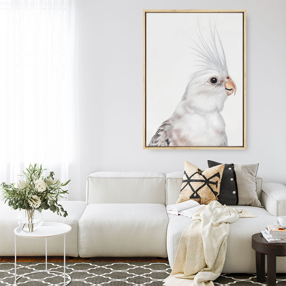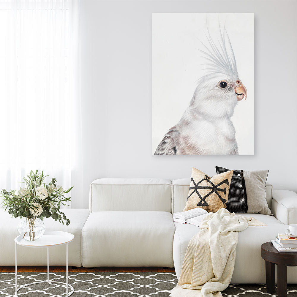 Shop Pia The White Cockatiel Canvas Print by The Print Emporium. This canvas wall art print from our hand painted aesthetic print collection, was originally hand painted by us and is now available as a reproduction printed stretched and ready-to-hang canvas artwork.
