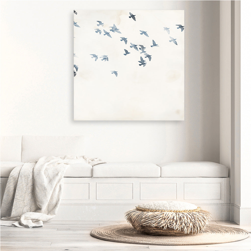 Shop Pigeons Sky (Square) Canvas Print by Design Fabrikken and update your wall decor at home easily with this flight of pigeons square artwork from our hand painted canvas print collection.