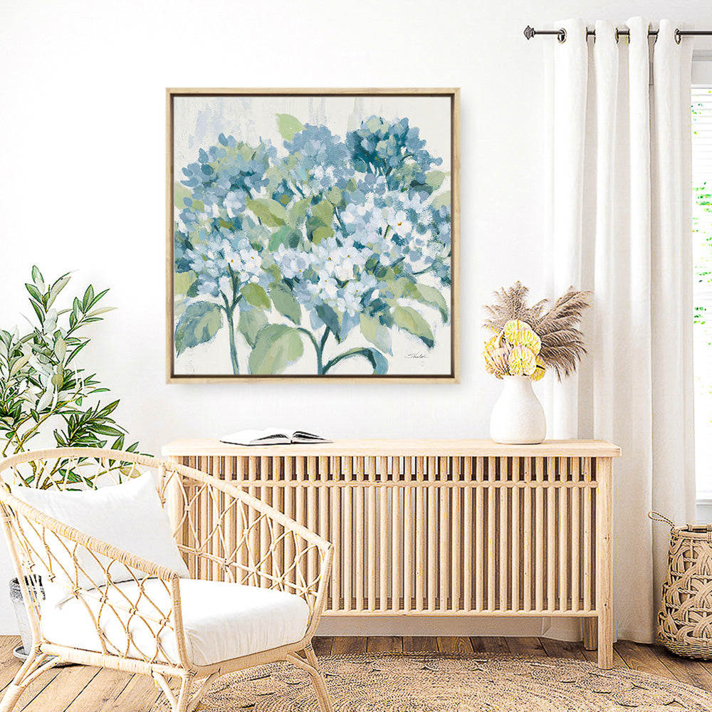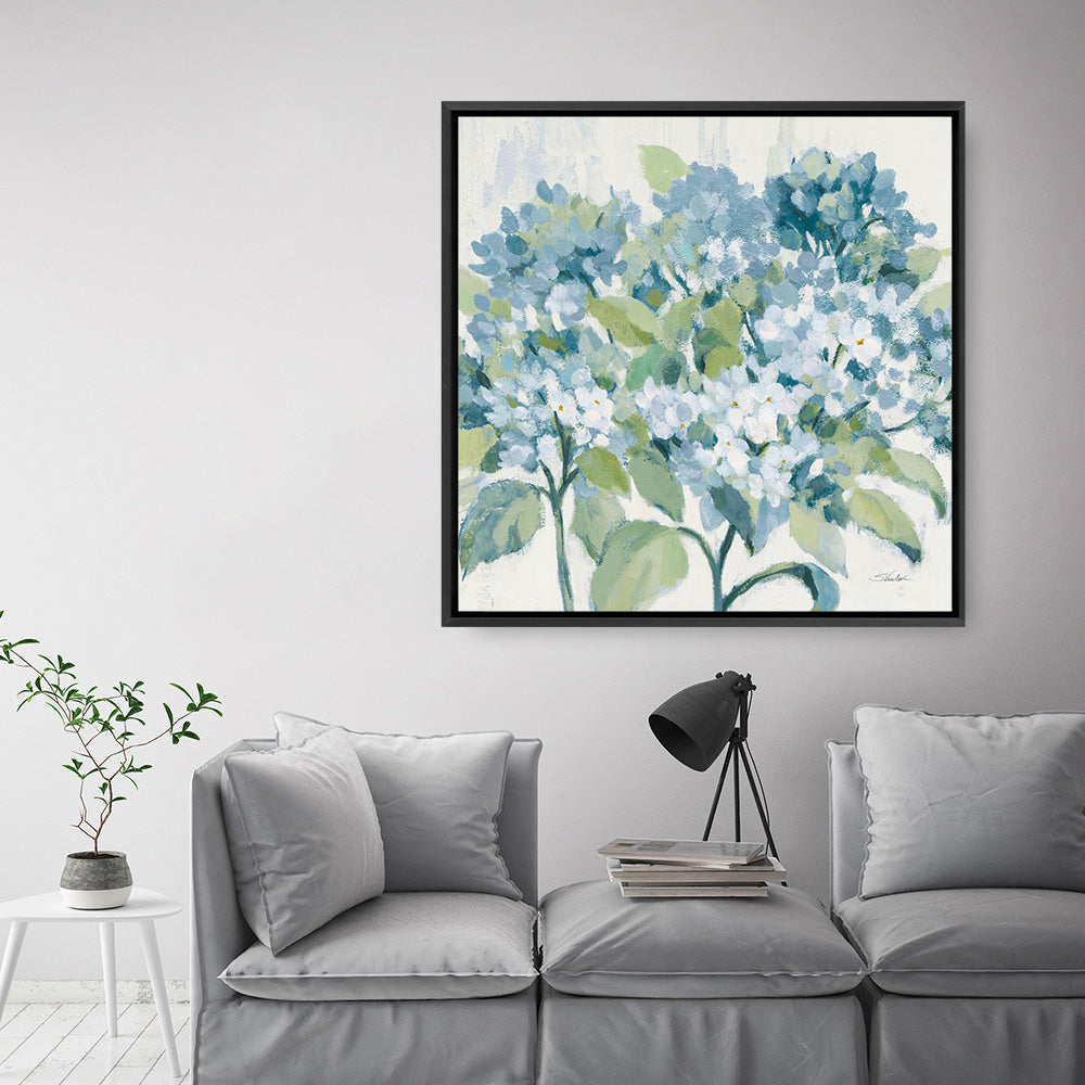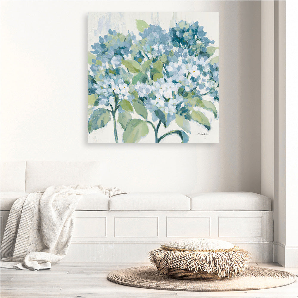 Shop Romantic Hydrangeas Blue (Square) Canvas Wall Art Print by Silvia Vassileva and update your wall decor at home easily with this beautiful bouquet stretched framed artwork from our hand painted canvas print collection.