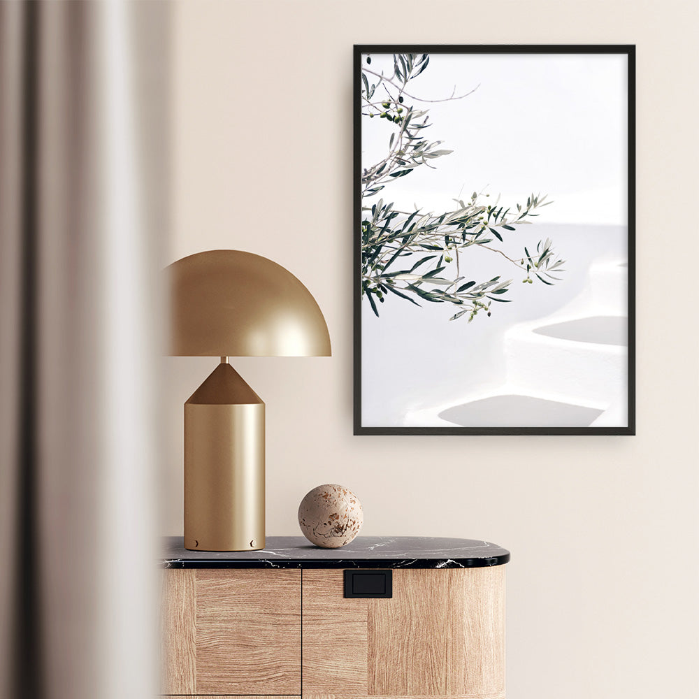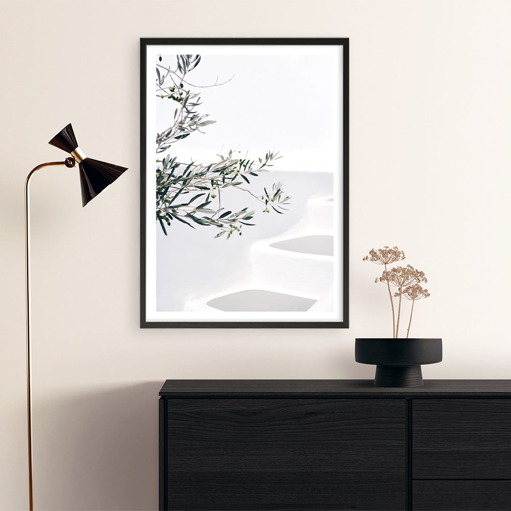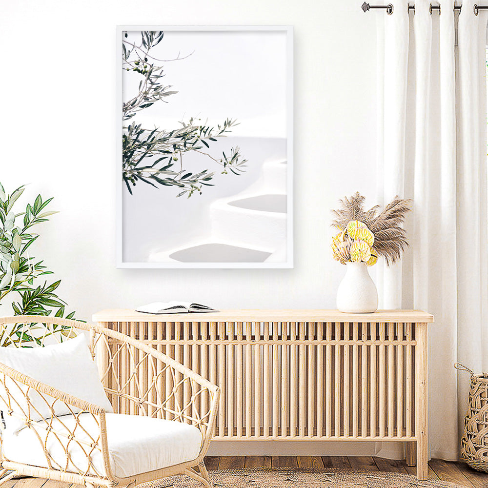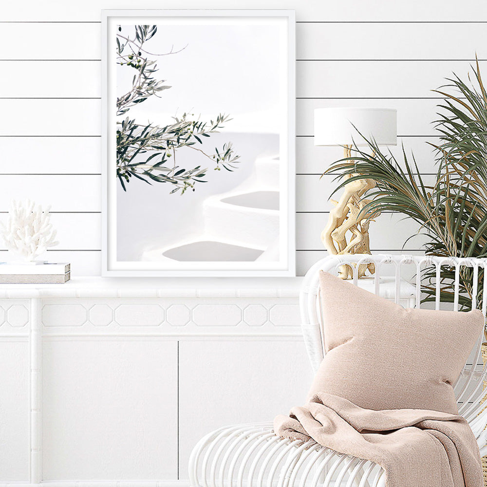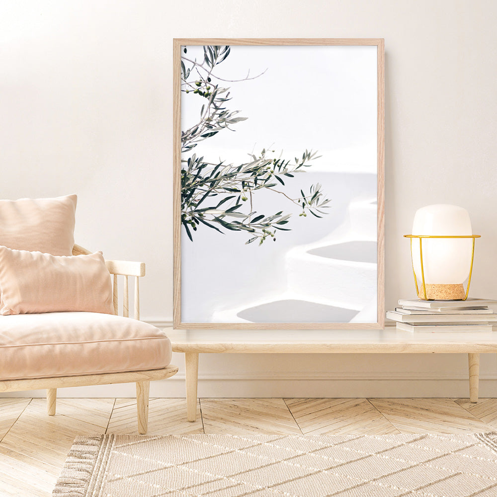 Shop Santorini Olive Branch Photo Wall Art Print by The Print Emporium and update your wall decor at home easily with this white mediterranean coastal boho themed artwork print from our photography prints collection.