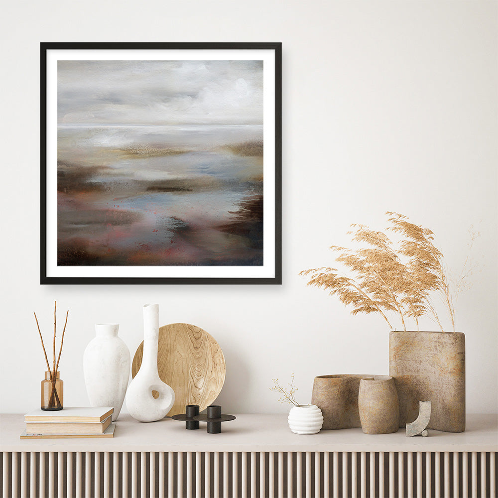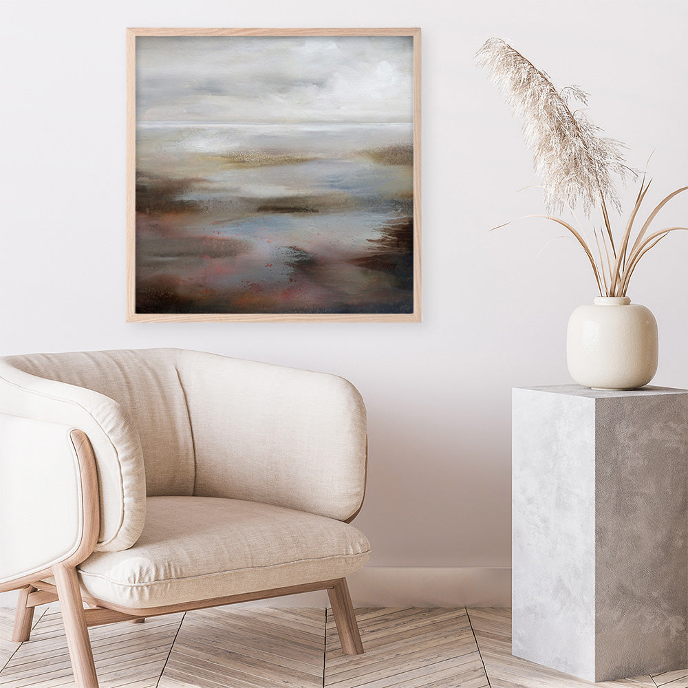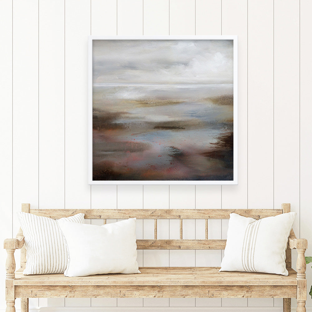 Shop Serene Image (Square) Art Print by Karen Hale and update your wall decor at home easily with this gloomy coastal view square artwork from our hand painted print collection.