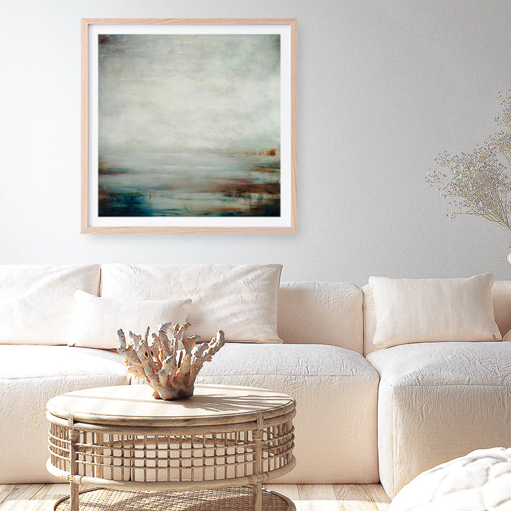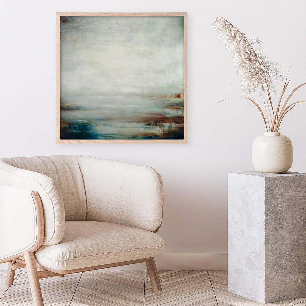 Shop Where The River Meets The Sea (Square) Art Print by Aondrea H. Maynard and update your wall decor at home easily with this serene convergence of river and ocean captured in a stunning square artwork from our hand painted print collection.
