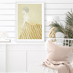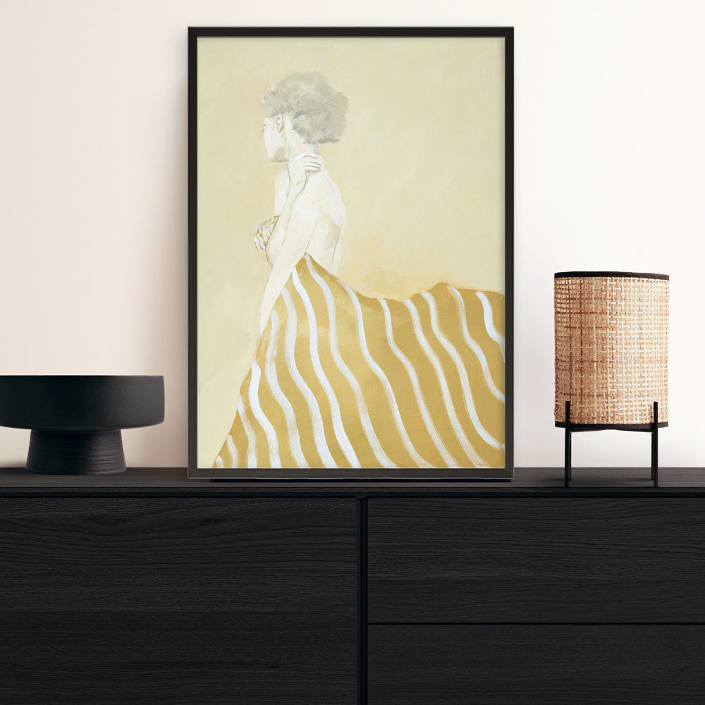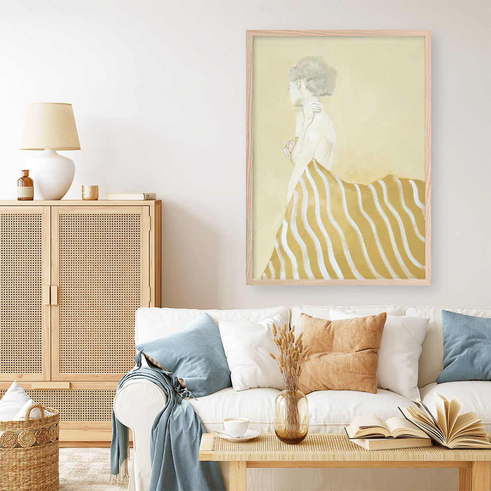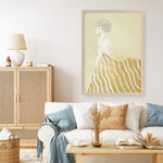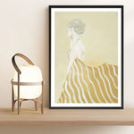 Shop Wherever You Are Art Print by Design Fabrikken and update your wall decor at home easily with this muted yellow painting of a woman from our hand painted print collection.