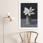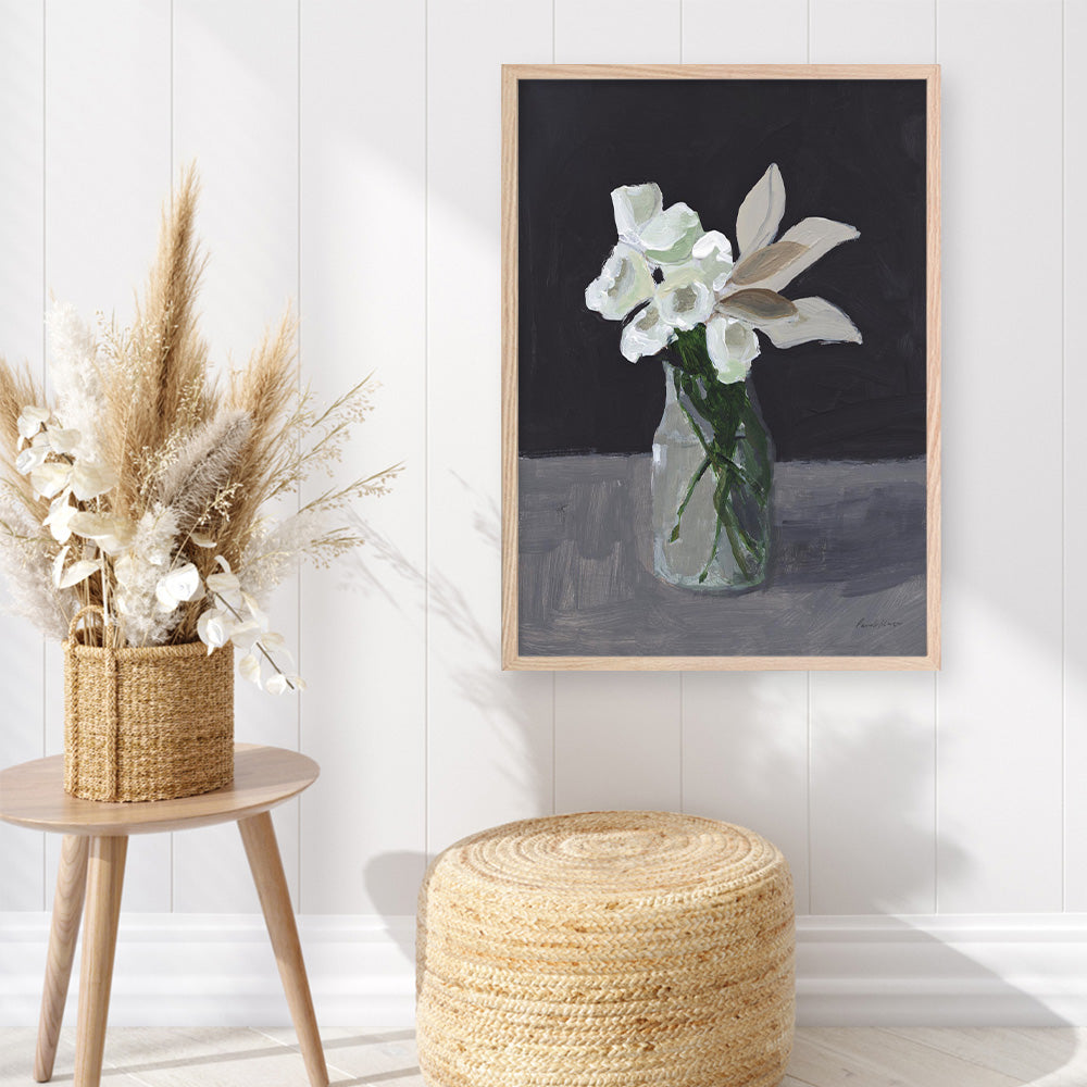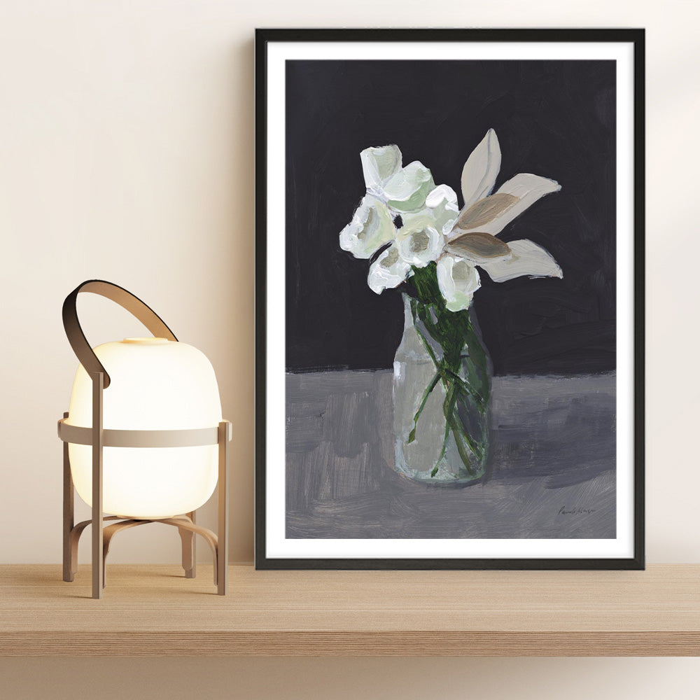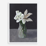 Shop White Blooms Art Print by Pamela Munger and update your wall decor at home easily with this beautiful painting of white flowers against a black background, from our abstract hand painted print collection.