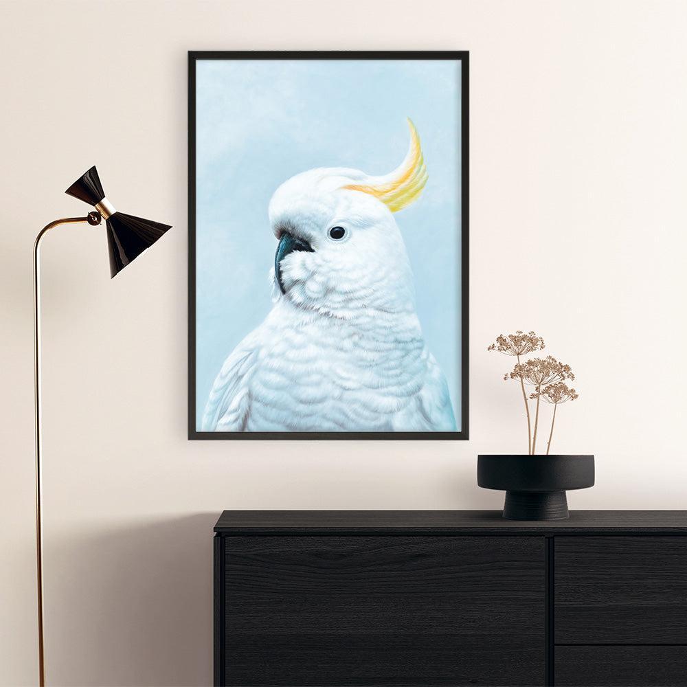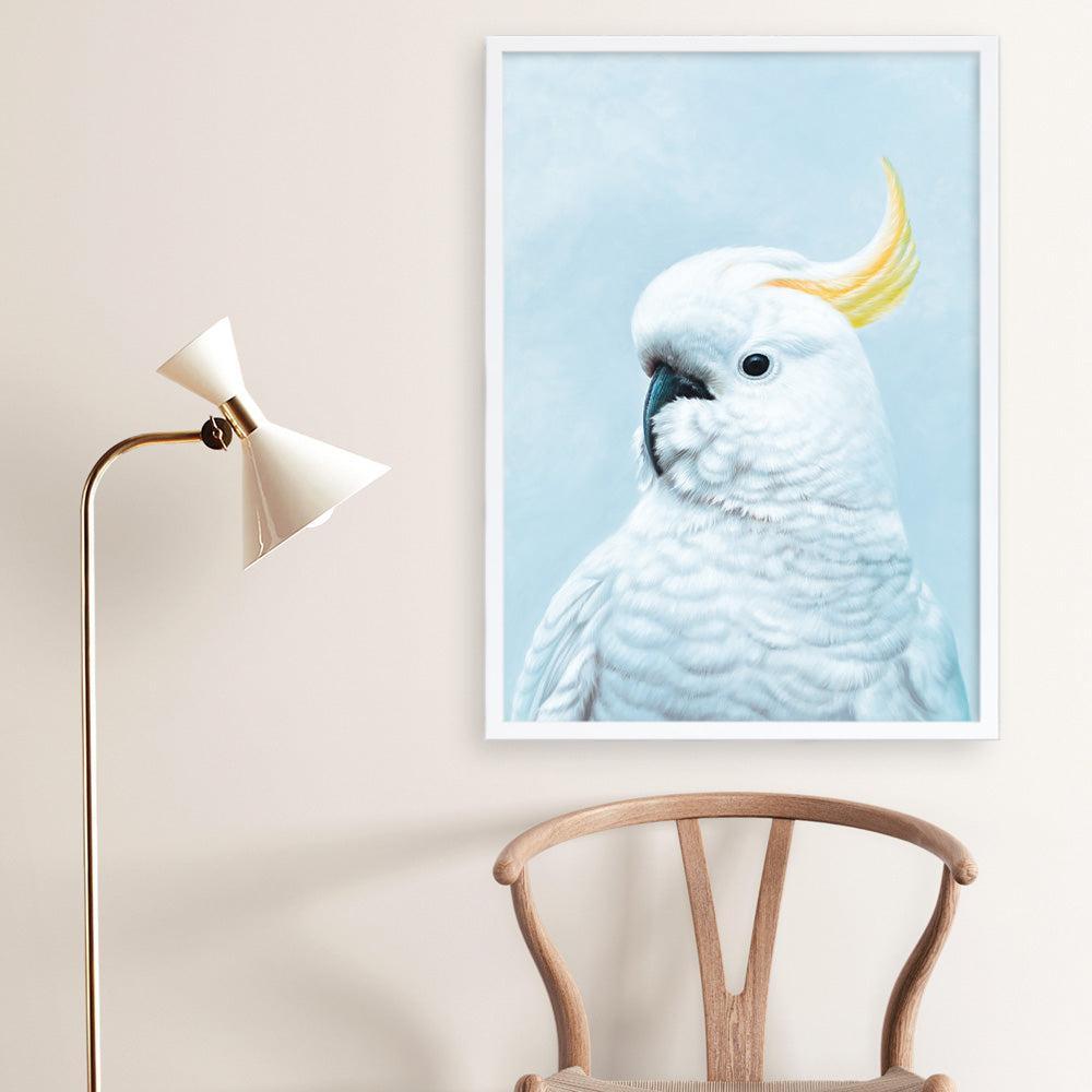 Shop White Cockatoo In Blue Art Print by The Print Emporium and update your wall decor at home easily with this artwork print from our hand painted print collection.