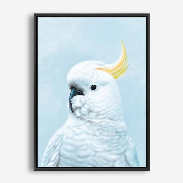 Shop White Cockatoo In Blue Canvas Print by The Print Emporium. This canvas wall art print from our hand painted aesthetic print collection, was originally hand painted by us and is now available as a reproduction printed stretched and ready-to-hang canvas artwork.