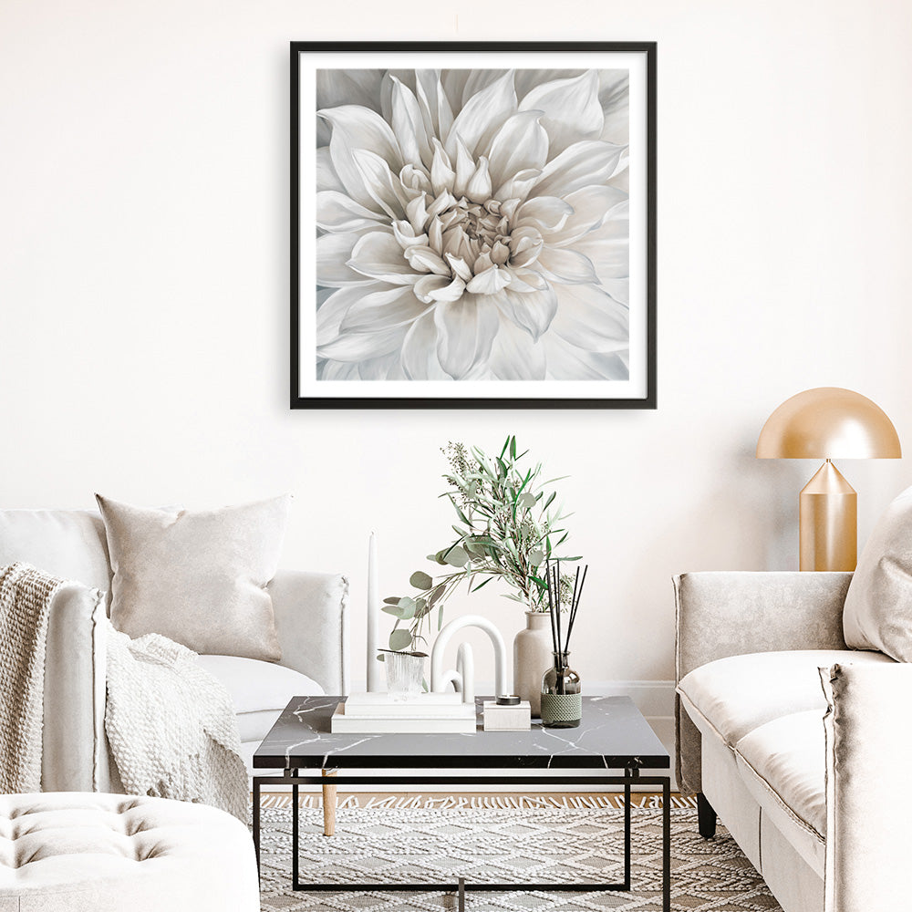 Shop White Dahlia (Square) Art Print by The Print Emporium and update your wall decor at home easily with this artwork print from our collection.