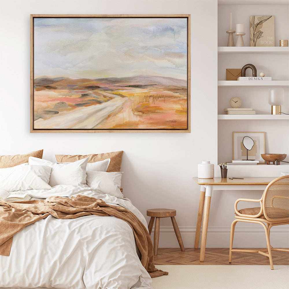 Shop White Desert RoadCanvas Print by Silvia Vassilevaand update your wall decor at home easily with this roadside desert landscape artwork from our abstract hand painted print collection.